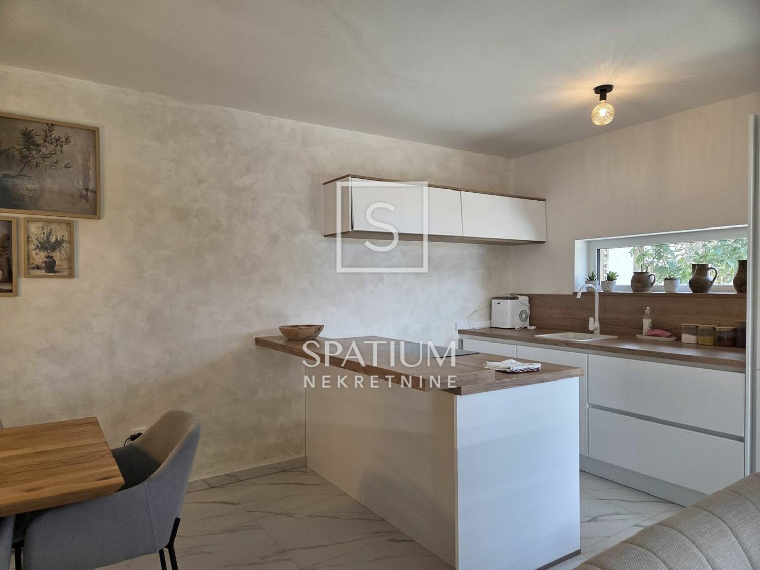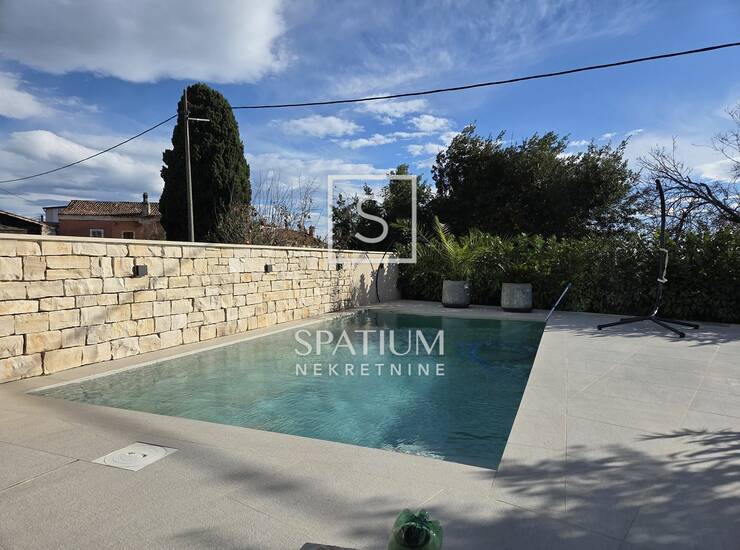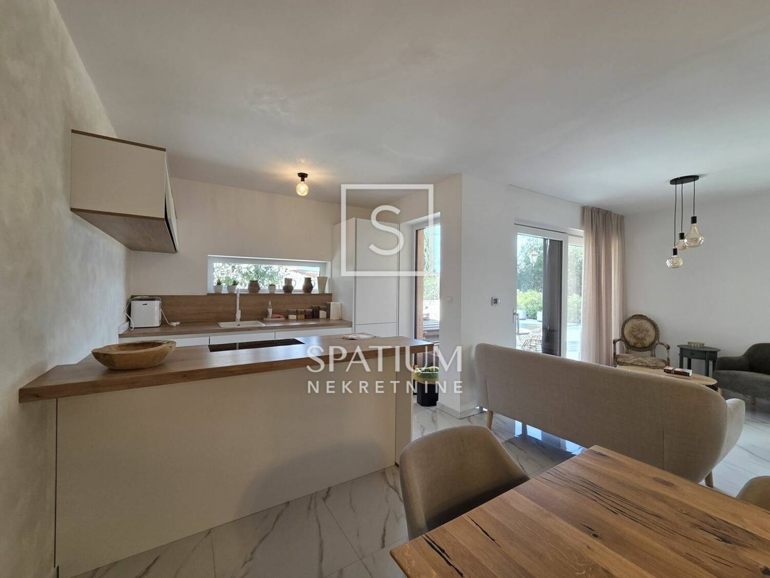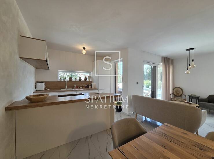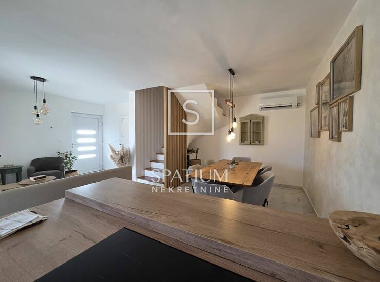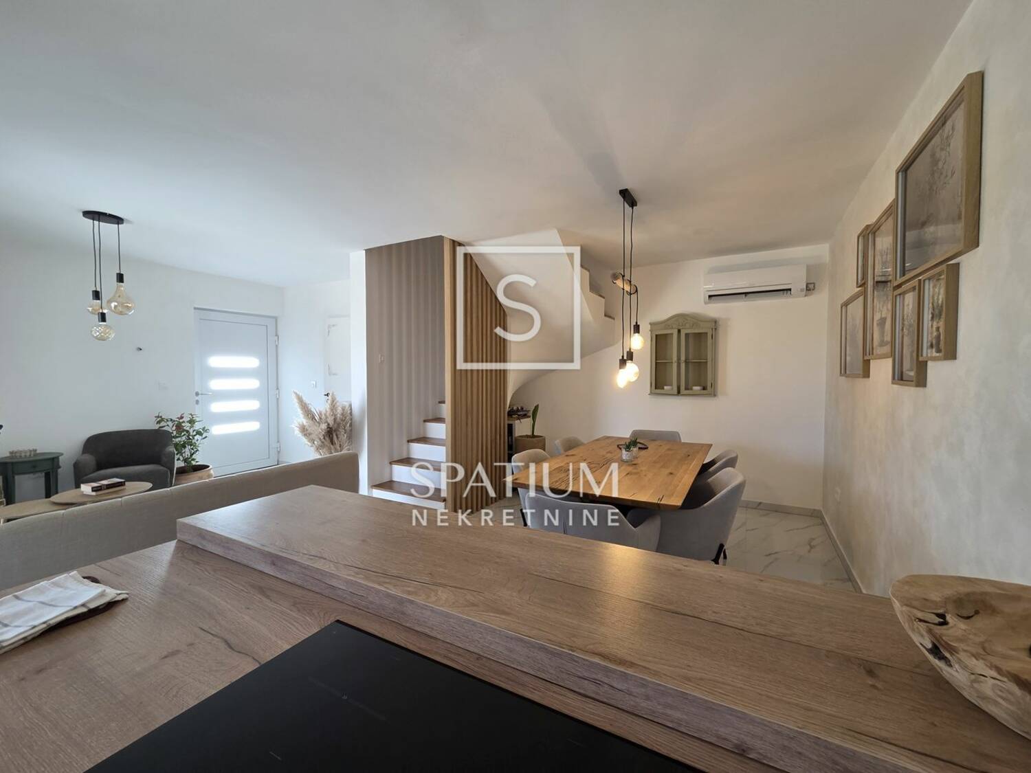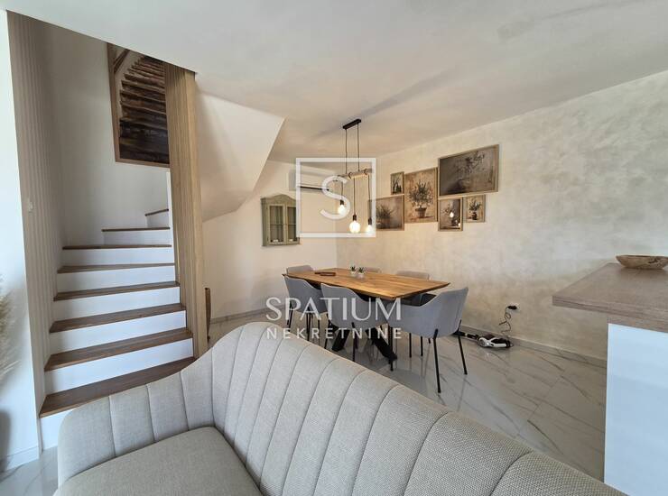 MARČANA, samo kod nas u ponudi imamo trosoban dvoetažni stan u kući s dvije stambene jedinice, idealan za ugodan život ili investiranje. U prizemlju se nalazi moderan otvoreni koncept – kuhinja, blagovaonica i dnevni boravak koji imaju izravan izlaz na terasu. Na istoj etaži nalazi se i jedna kupaonica. Na katu su smještene tri spavaće sobe te dodatna kupaonica. Stan je opremljen podnim grijanjem kroz cijeli prostor, ima dva klima uređaja, PVC i aluminijsku stolariju te termoizolacijsku fasadu. U dvorištu vas čeka uređena terasa s ljetnom kuhinjom, bazenom i sunčalištem, kao i dva privatna parkirna mjesta. Nekretnina posjeduje uredno vlasništvo i dokumentaciju.