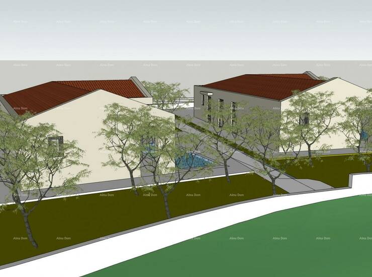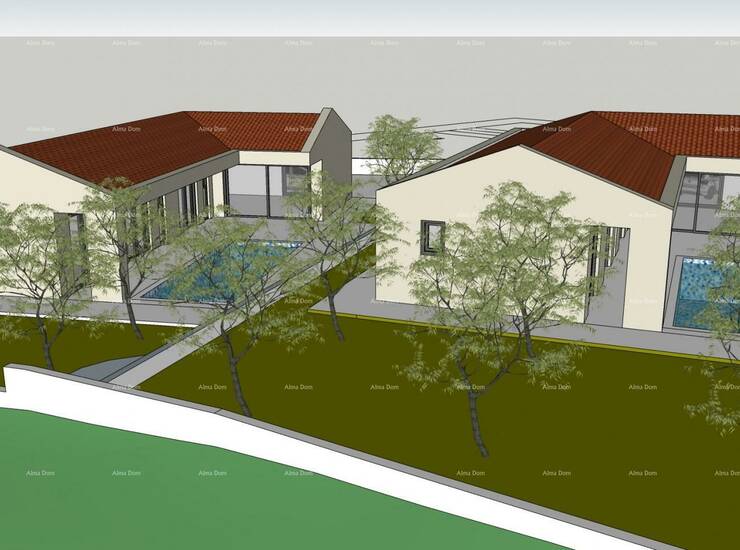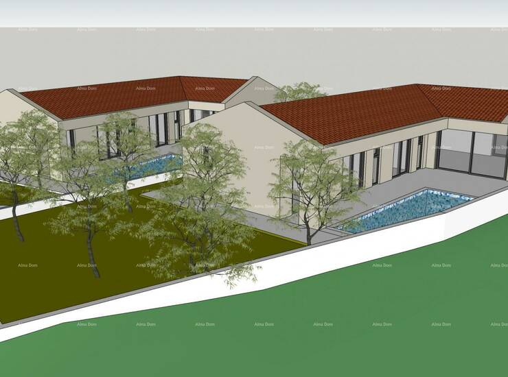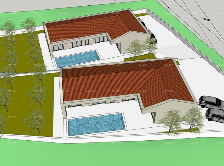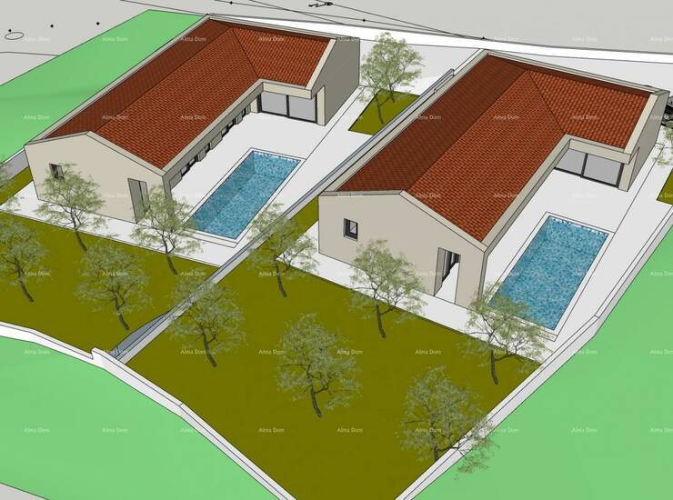 Prodajemo dvije odvojene građevinske parcele, svaka s izrađenim glavnim projektom i pravomoćnom građevinskom dozvolom za modernu prizemnu kuću s bazenom. Gradnja može započeti odmah.