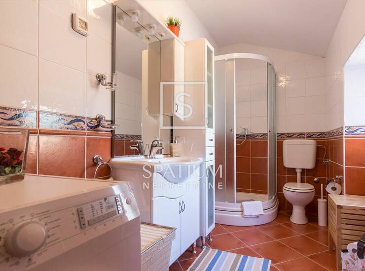 Sastoji se od prizemlja i kata. U prizemlju nalazimo veliki dnevni boravak s kuhinjom i blagovaonicom te kupaonicu dok su se na katu smjestile tri spavaće sobe. Na terasi se nalazi i dodatni prostor za druženje s ljetnom kuhinjom i kupaonicom. Na lijepo uređenoj i ograđenoj okućnici od 300m2 nalazi se i bazen sa sunčalištem.