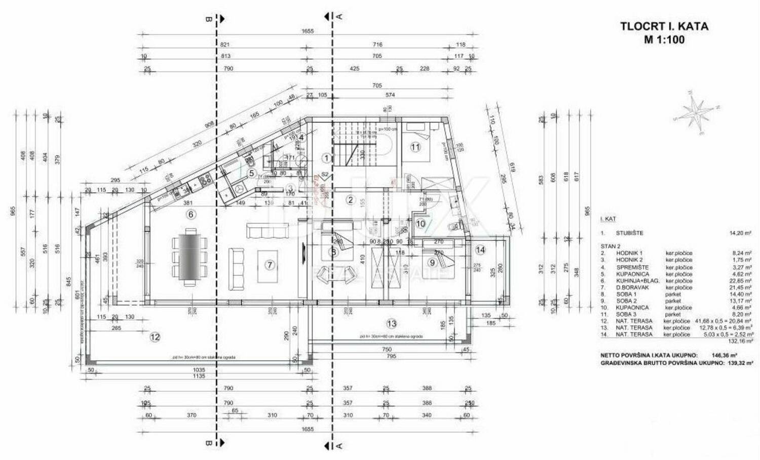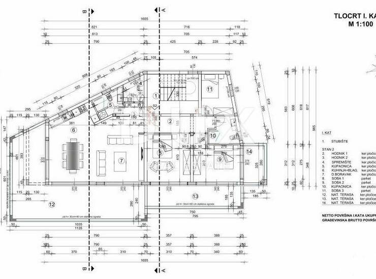 Dux predstavlja impresivnu novogradnju s panoramskim pogledom na Kvarnerski zaljev, smještenu u Matuljima. Objekt se sastoji od tri stambene jedinice, svaka smještena na zasebnoj etaži. Ovaj stan nalazi se na prvom katu te uključuje ulazni hodnik, prostranu open-space kuhinju s blagovaonicom i dnevnim boravkom, te veliku terasu od 60 m² koja obuhvaća jugoistočni dio zgrade. Stan ima tri spavaće sobe, dvije kupaonice i dodatno spremište. Osigurana su i dva parkirna mjesta.