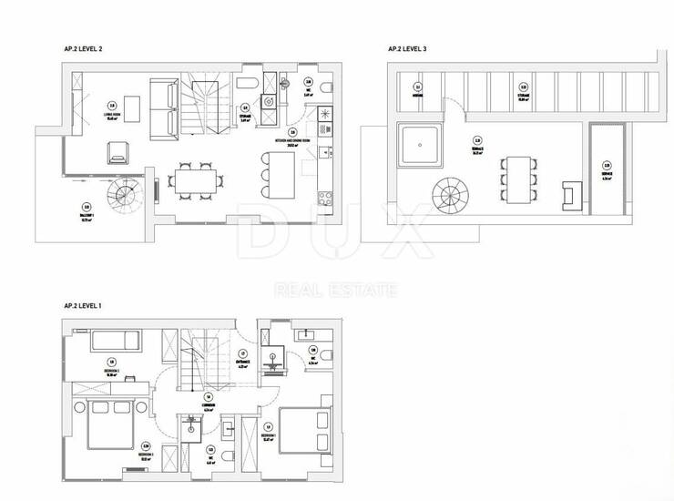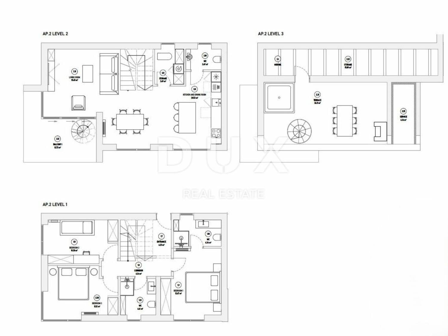 Stan broj 2 sa KROVNOM TERASOM s ukupnom površinom od 141m2 proteže se preko prvog i drugog kata te ima i potkrovlje, pružajući obilje prostora za komforno stanovanje. Stambena površina stana bez krovne terase iznosi 115m2.