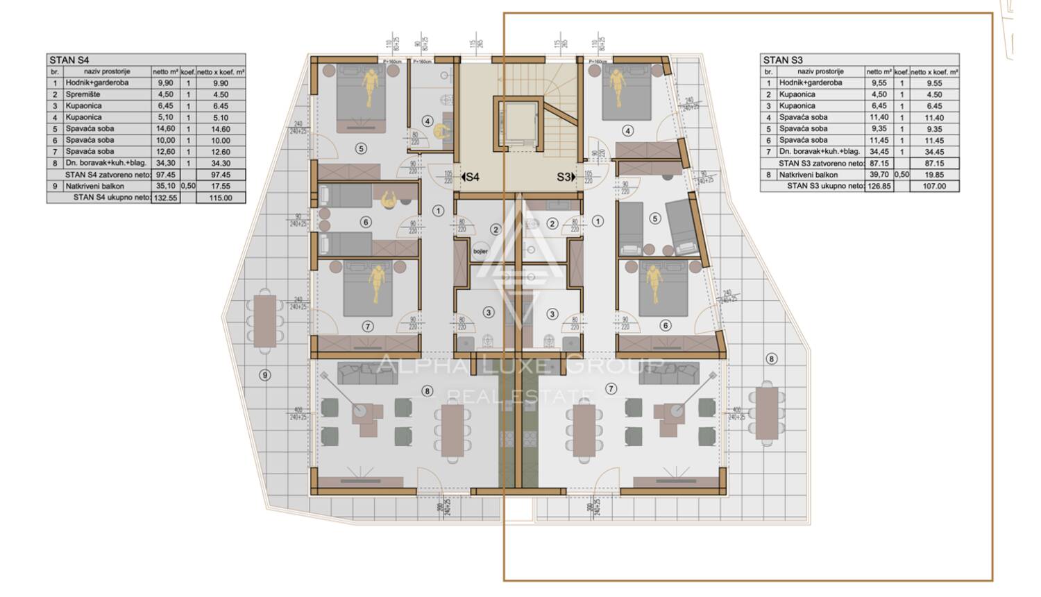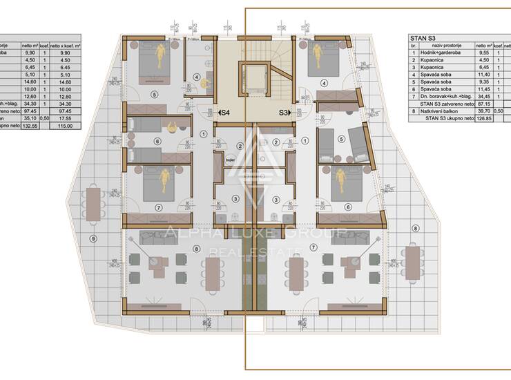 Stan nudi dobro organiziran raspored koji uključuje ulazni hodnik s garderobnim prostorom, tri prostrane spavaće sobe i dvije moderne kupaonice. Otvoreni dnevni prostor objedinjuje elegantnu kuhinju, blagovaonicu i svijetli dnevni boravak, svi s izravnim izlazom na natkriveni balkon s pogledom na more. Dnevni boravak i spavaće sobe povezani su s vanjskim prostorom, što osigurava obilje prirodnog svjetla i ugodnu, prozračnu atmosferu.