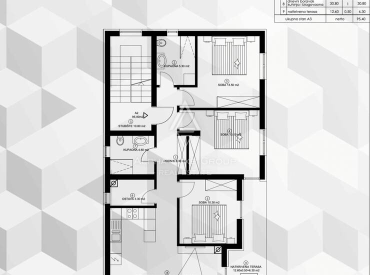 Stan ima pažljivo osmišljen raspored koji uključuje ulazni hodnik, svijetli dnevni boravak otvorenog koncepta povezan s kuhinjom i blagovaonicom, tri spavaće sobe od kojih jedna ima vlastitu kupaonicu, dodatnu kupaonicu, ostavu te natkrivenu terasu idealnu za opuštanje na otvorenom. Nekretnina također uključuje spremište u prizemlju zgrade i dva privatna parkirna mjesta.