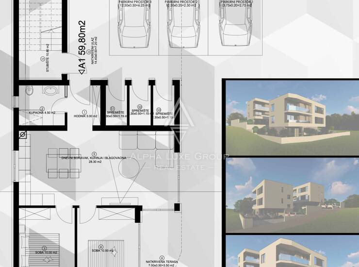 Stan se nalazi u prizemlju i ima funkcionalan raspored koji uključuje ulazni hodnik, open space dnevni boravak s kuhinjom i blagovaonicom, dvije spavaće sobe i kupaonicu. Dnevni prostor ima izravan izlaz na natkrivenu terasu, čime se postiže skladna povezanost unutarnjeg i vanjskog prostora.