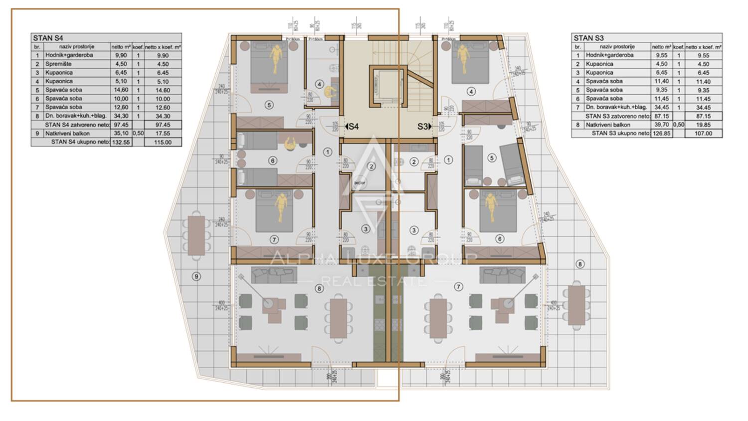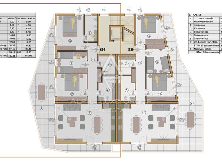 Stan ima dobro osmišljen raspored koji uključuje ulazni hodnik s garderobnim prostorom, praktično spremište, tri prostrane spavaće sobe i više kupaonica, uključujući vlastitu en suite kupaonicu u glavnoj spavaćoj sobi. Otvoreni dnevni prostor objedinjuje modernu kuhinju, blagovaonicu i svijetli dnevni boravak, svi s izravnim izlazom na natkriveni balkon s pogledom na more. Dnevni boravak i spavaće sobe povezani su s vanjskim prostorom, osiguravajući obilje prirodnog svjetla i ugodnu, prozračnu atmosferu.