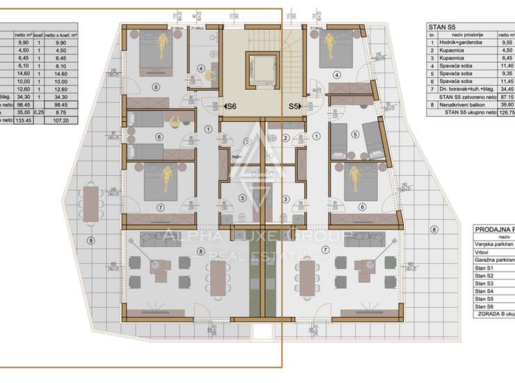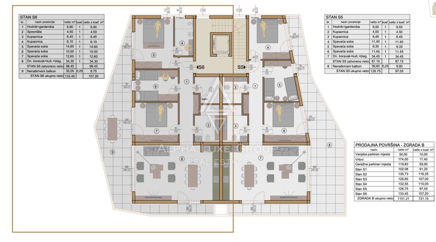 Budući vlasnici imaju mogućnost kupnje vanjskih ili garažnih parkirnih mjesta u podrumu, dostupnih putem rampe i povezanih liftom koji povezuje sve etaže zgrade. Interijer će biti uređen visokokvalitetnim materijalima, uključujući vrhunsku keramiku i parket u spavaćim sobama. Grijanje i hlađenje osigurani su klima uređajima i električnim podnim grijanjem, čime se osigurava maksimalna udobnost tijekom cijele godine.