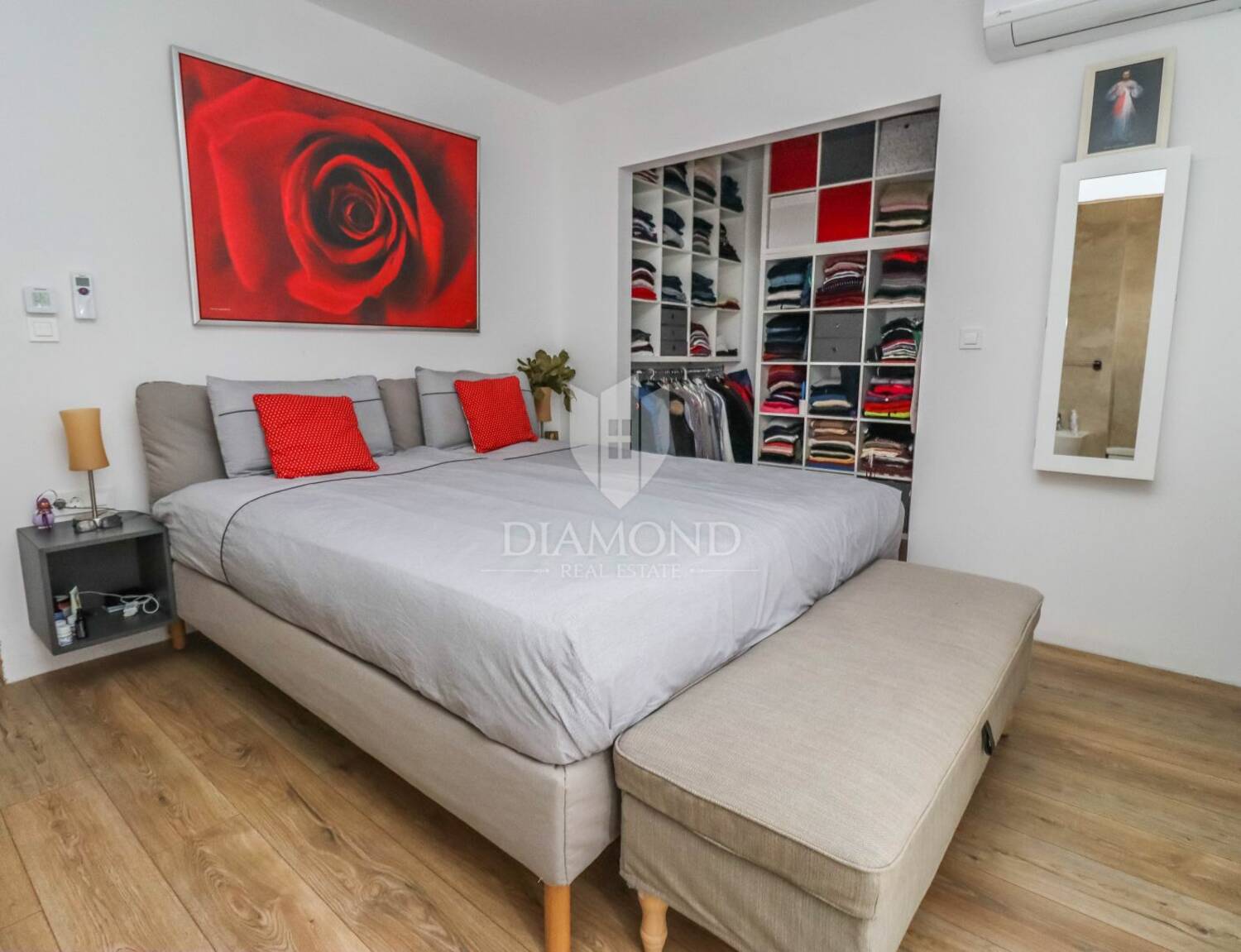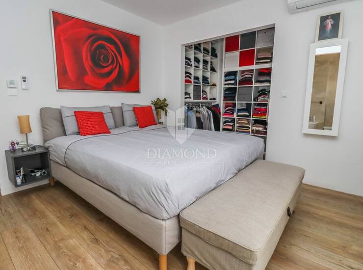 U prizemlju se nalazi prostrani open space dnevni boravak s kuhinjom i blagovaonicom, s izlazom na terasu i bazen, uz gostinjski WC i tehničku sobu. Na višim etažama raspoređene su četiri spavaće sobe, svaka s vlastitom kupaonicom i walk-in ormarom. Prvi kat obuhvaća jednu spavaću sobu i ured, drugi kat jednu spavaću sobu, dok se na zadnjem katu nalaze dvije dodatne spavaće sobe. Ovakav raspored osigurava visoku razinu funkcionalnosti i privatnosti, idealnu za obiteljski život ili luksuzni turistički najam.
