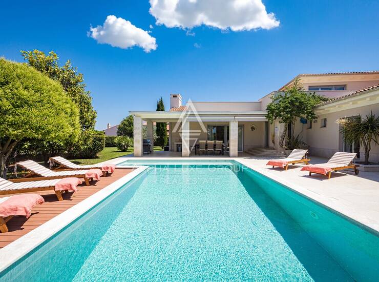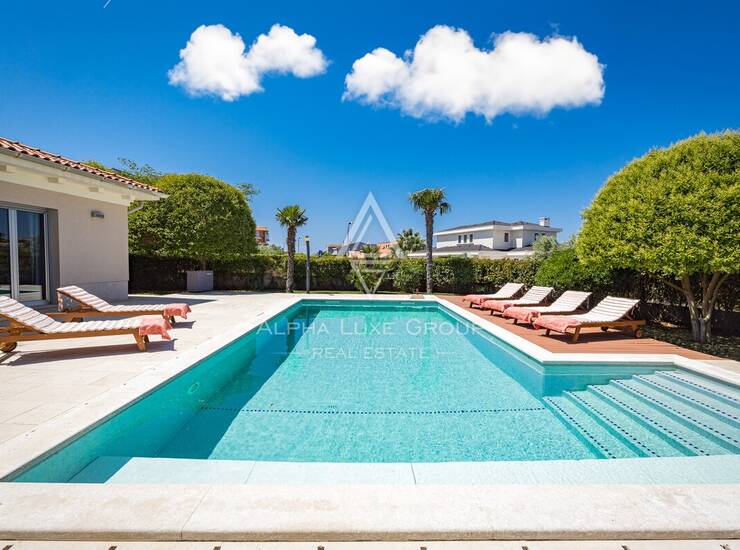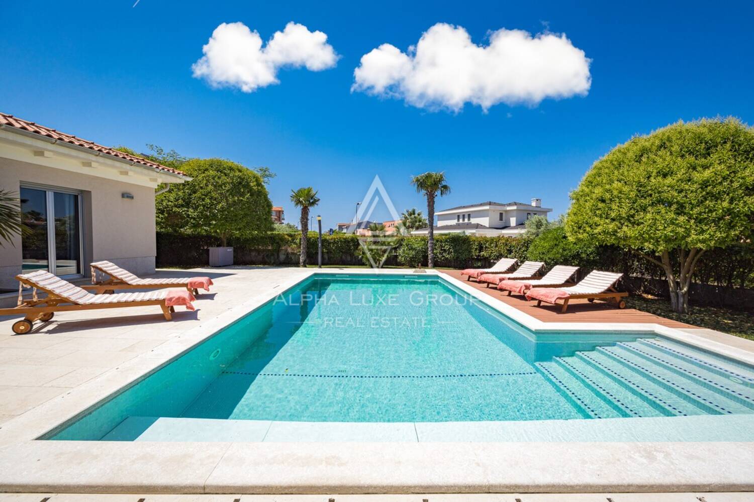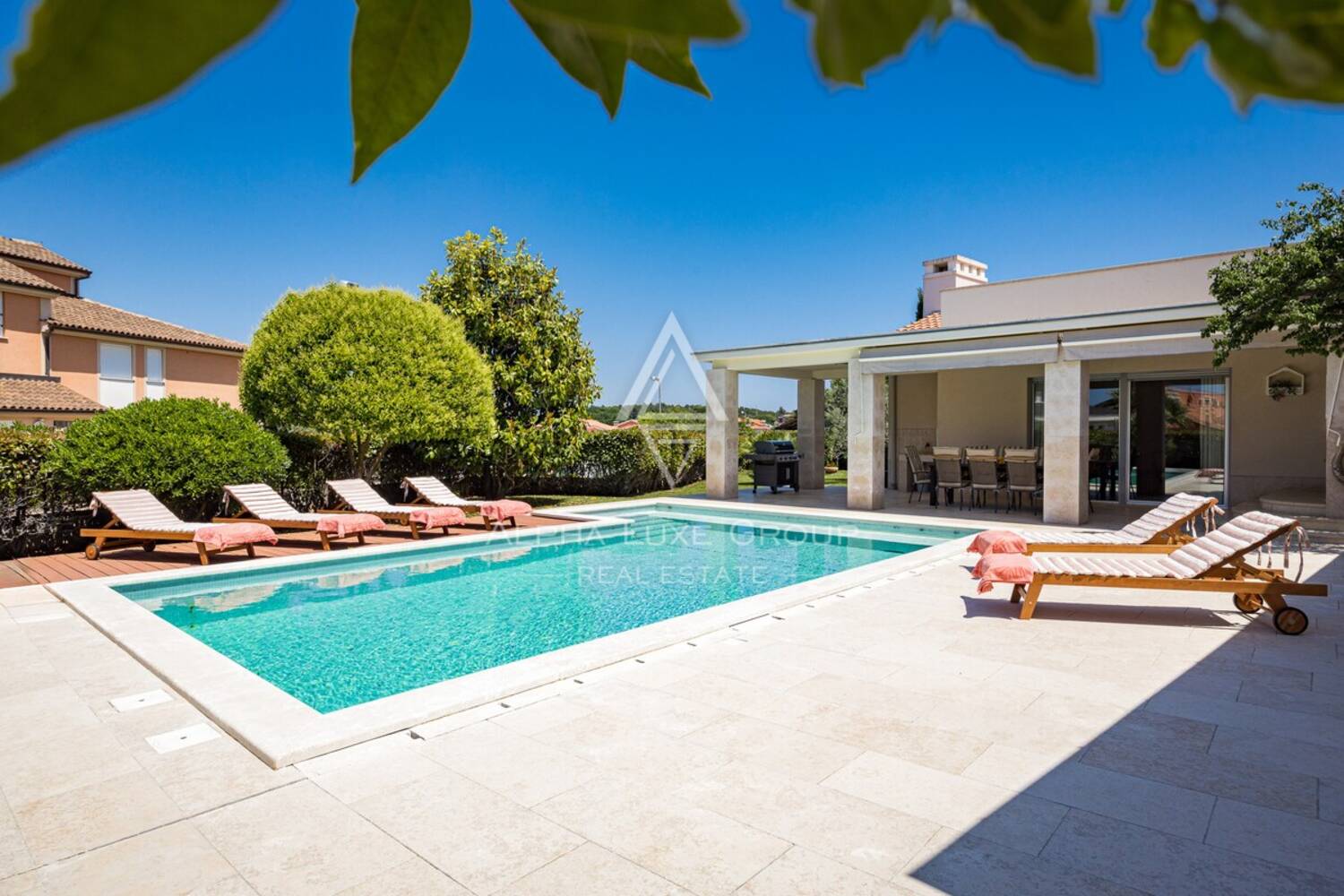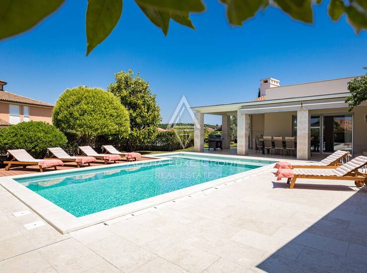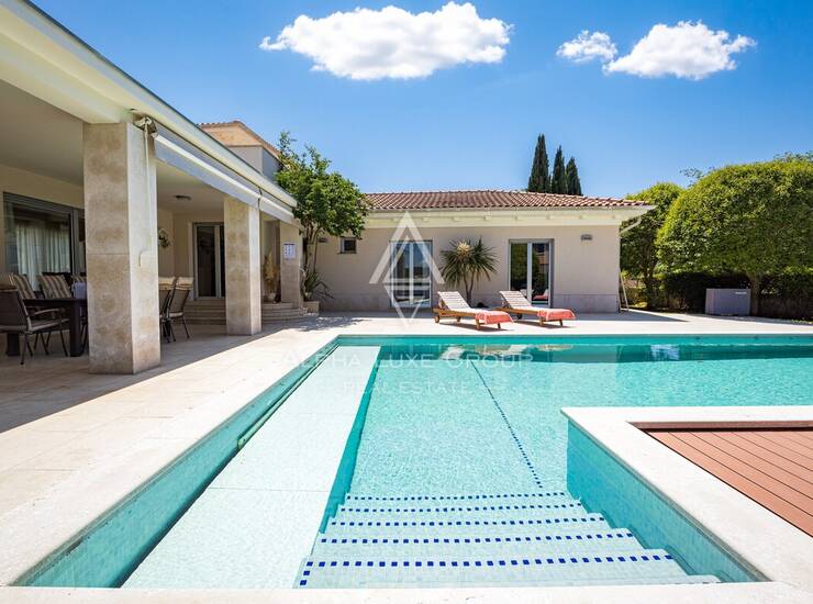 Eksterijer je dizajniran za opuštanje i druženje, s mediteranskim krajolikom, ljetnom kuhinjom, roštiljem i nekoliko terasa za sjedenje. Grijani bazen sa slanom vodom i automatskim pokrovom osigurava udobnost tijekom cijele godine. Nekretnina je opremljena vrhunskim materijalima, podnim grijanjem, klima uređajima, ALU stolarijom, alarmnim sustavom, pametnim roletama i energetskim certifikatom A+.