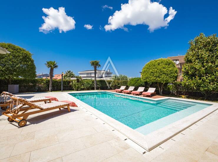 Smještena u ekskluzivnom priobalnom naselju Volme, samo 200 metara od mora, ova elegantna vila nudi profinjeni mediteranski stil života uz iznimnu udobnost i privatnost. Prostire se na tri etaže, s 277 m² unutarnjeg prostora i prekrasno uređenim vrtom od 800 m² koji uključuje više terasa, sunčalište, grijani bazen i prostrano dvorište.