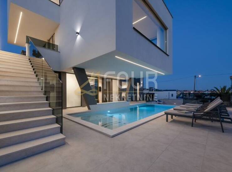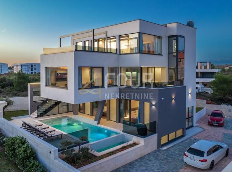 Vila se prostire na 440 m2 i raspoređena je na četiri etaže povezane panoramskim liftom koji pruža jedinstven doživljaj kretanja kroz prostor. Već pri ulasku ostavlja snažan dojam elegancije i funkcionalnosti. U suterenu se nalazi prostrana zona za druženje koja uključuje kuhinju, prostor za zabavu sa stolnim nogometom i velikim stolom, vinoteku, dodatni toalet, strojarnicu bazena, kotlovnicu i ostavu, stvarajući idealno mjesto za opuštanje i druženja tijekom cijele godine.