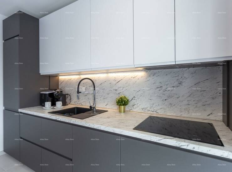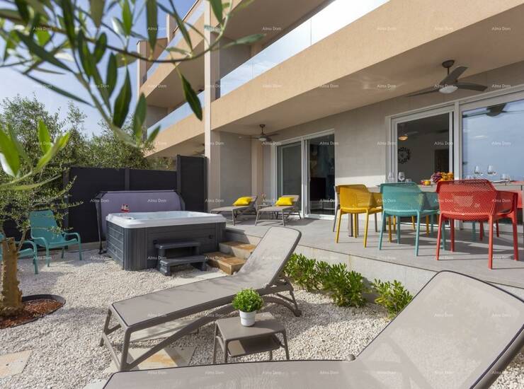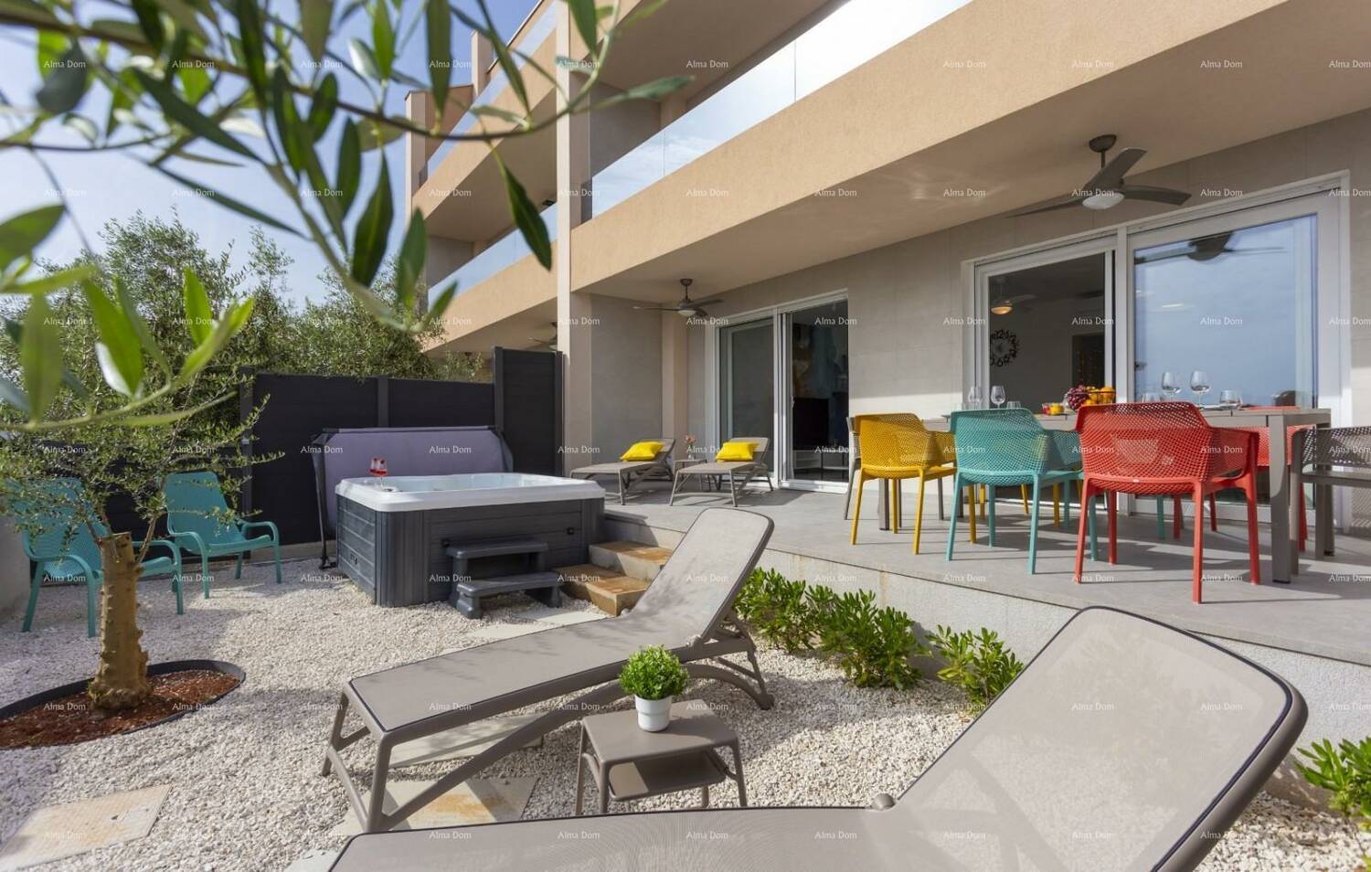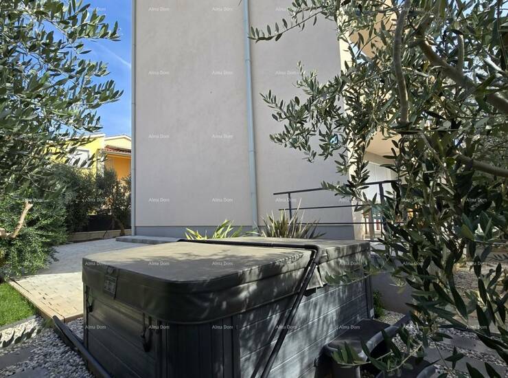 hodnik, tehnička soba, kupaonica, dnevni boravak s kuhinjom i blagovaonicom i loggie te uređenog vrta s jacuzijem i vanjskim tušem.