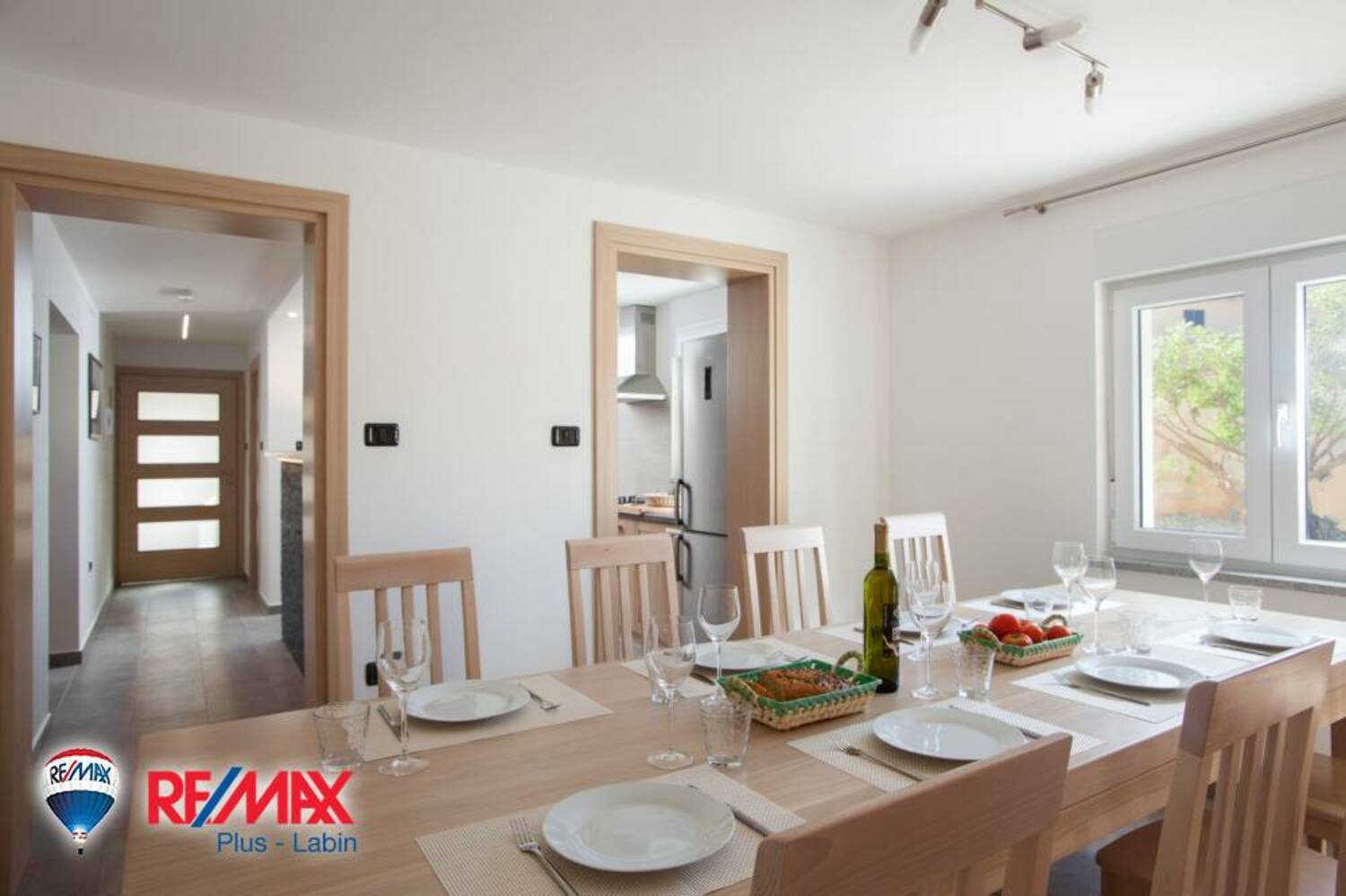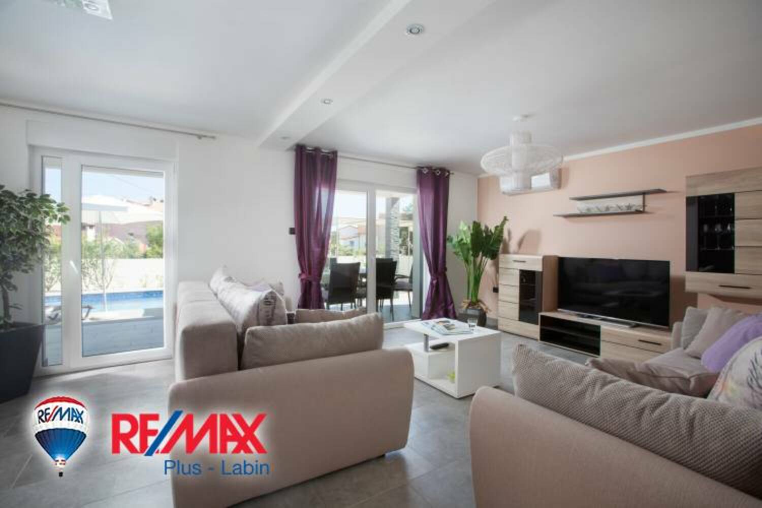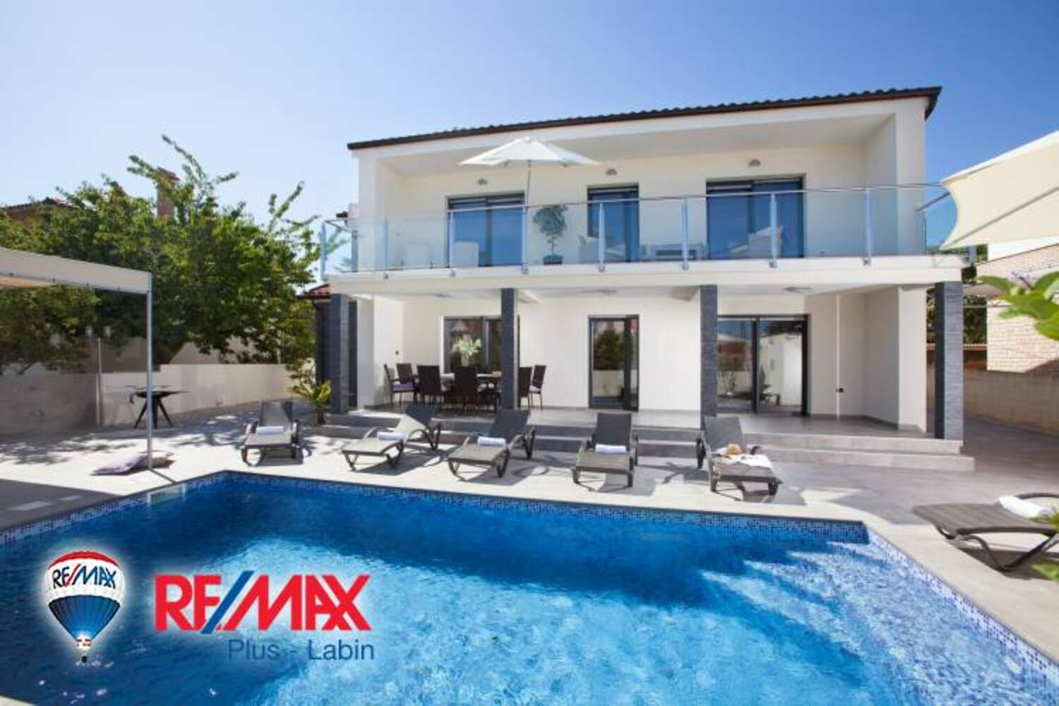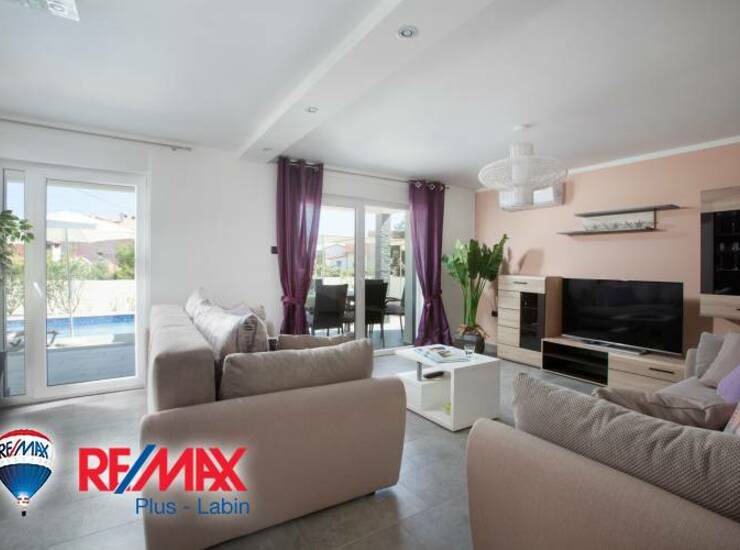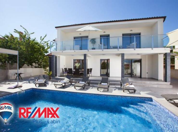 Moderna, kvalitetno građena kuća stambene površine 220m2 smještena na parceli od 500 m2 u Medulinu sa vanjskim otvorenim bazenom i pomoćnom zgradom koja služi kao spremište.Kuća nudi četiri spavaće sobe i 4 kupatila, kuhinju sa blagovaonom i dnevni boravak.Sve prostorije su klimatizirane, a postoji i dimnjak tako da se može ugraditi i peć na drva ili pelete kao dodatna opcija.Sobe smještene na 1.katu imaju vanjsku terasu, bazen okružuje uređena plaža i ležaljke za uživanje u sunčanim danima ukoliko vam se ne ide na plažu.