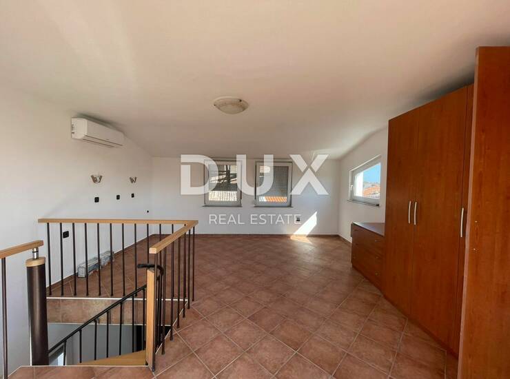 Vanjskim stepeništem je povezan prvi kat kuće koji nudi dvoetažan stan i sastoji se od prostranog dnevnog boravka sa kuhinjom i blagovaonicom, kupaonica, spavaća soba te unutarnje stepenice povezane sa drugom etažom koja može predstavljati dodatnu spavaću sobu.