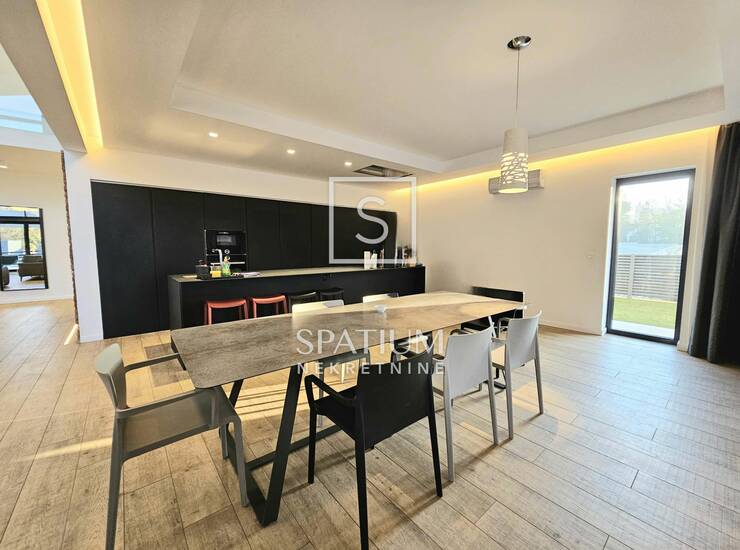 U dvorištu se nalazi bazen od površine 52m2 sa slanom vodom, hidromasažom, opremljen sustavom grijanja putem zasebne dizalice topline te automatskim pokrovom. Okućnica je u potpunosti uređena i održavana, s ugrađenim automatskim sustavom navodnjavanja, a cijela parcela osigurava visoku razinu privatnosti.