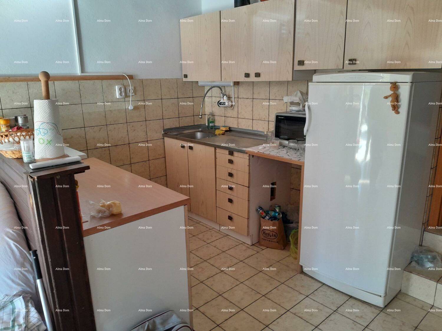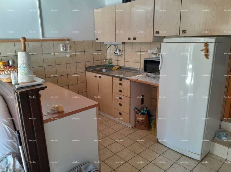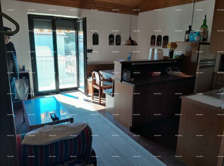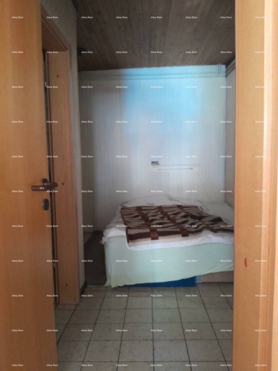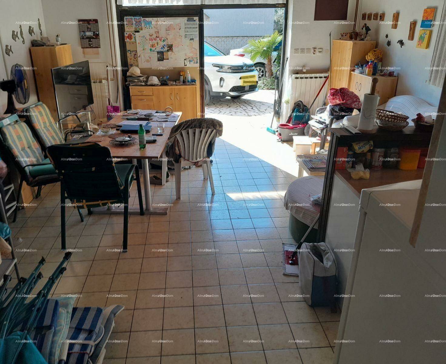 Kuca je površine 110 m2 a vrt 100 m2. Pola kuce prodaje se u vertikali s lijeve strane kuće. Prizemlje ima ulaz, dnevni boravak sa kuhinjom, spavaću sobu, na katu je isti raspored, osim sto je uz plafon napravljen mali podest s stepenicama i smjesten krevet. Kat posjeduje i balkon.