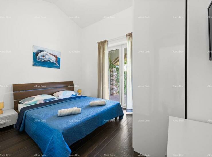 Ova vila sastoji se od prizemlja i prvog kata. U prizemlju vile, nalazi se prostrani, udobni dnevni boravak povezan s potpuno opremljenom kuhinjom s blagovaonicom. Iz dnevnog boravka izlazi se na veliku terasu s bazenom od 32m2 i ležaljkama. Na ovom katu se nalazi i dvije klimatizirane spavaće sobe s bračnim krevetom i TV-om, kao i jedna kupaonica s tušem.