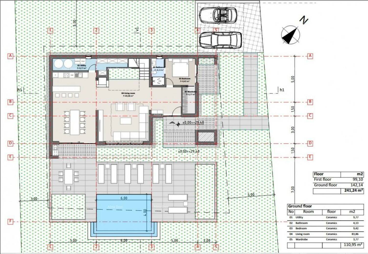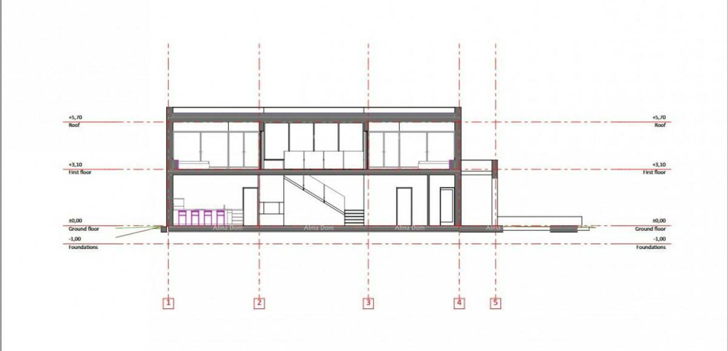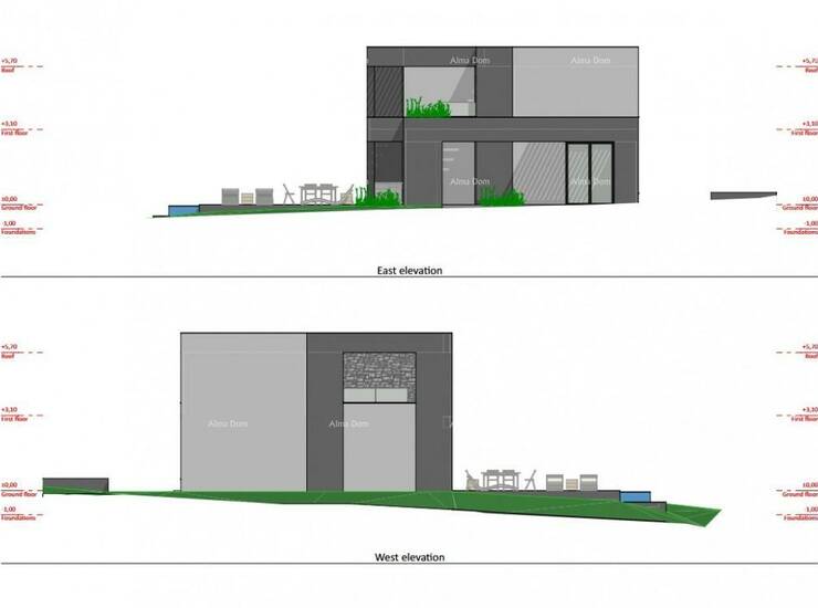 U prizemlju vila će se sastojati od prostranog dnevnog boravka s izlazom na terasu, kuhinje, blagovaone, jedne spavaće sobe i jedne kupaonice.
