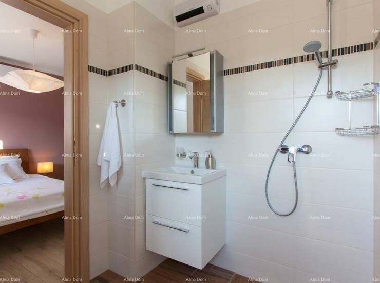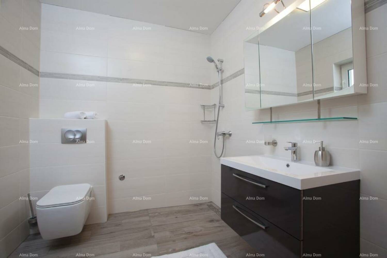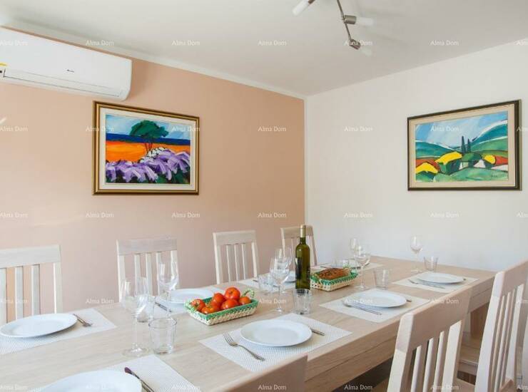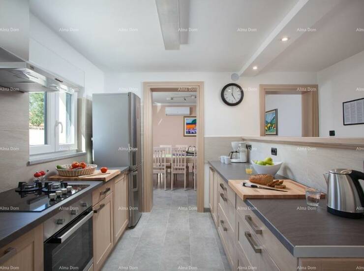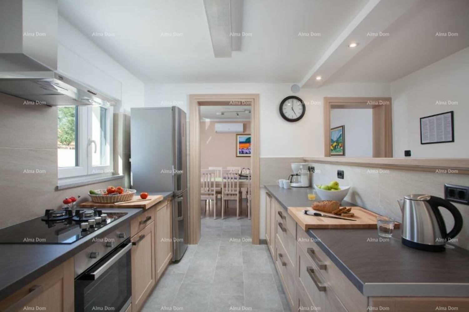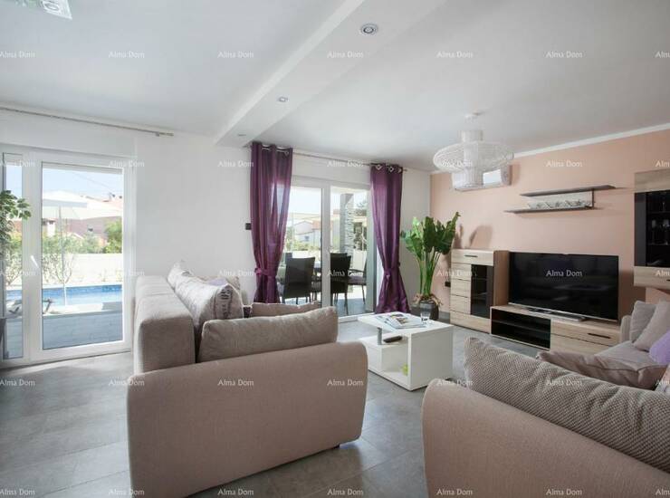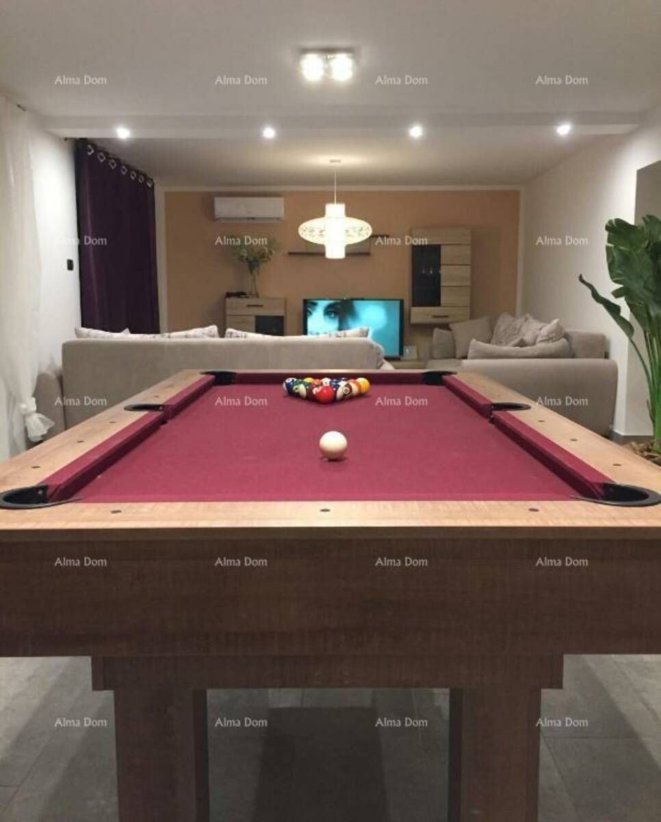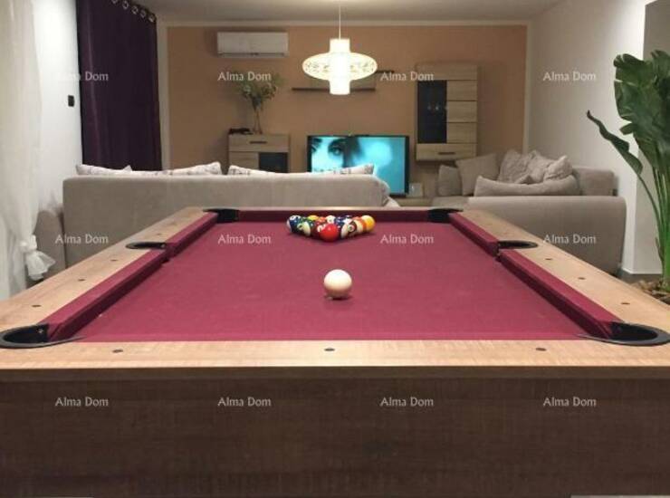 Prodaje se kuća modernog dizajna u Medulinu. Kuća se sastoji od dnevnog boravka, četiri spavaće sobe, četiri kupaonice, prostorije za biljarski stol, velike kuhinje, odvojene blagovaonice. Na gornjem katu su 4 spavaće sobe i 3 kupaonice s WC-om i tuš kabinom. Svaka spavaća soba opremljena je klima uređajem koji će uvijek osigurati željenu temperaturu. U podrumu se nalazi velika dnevna soba na raspolaganju. Dnevni boravak je opremljen SAT - TV i biljarskim stolom. Kuća broji ukupno 220 m2 stambene površine. Kuhinja je velika i otvorena, s barom i odvojenom blagovaonicom namijenjenom za osam osoba.