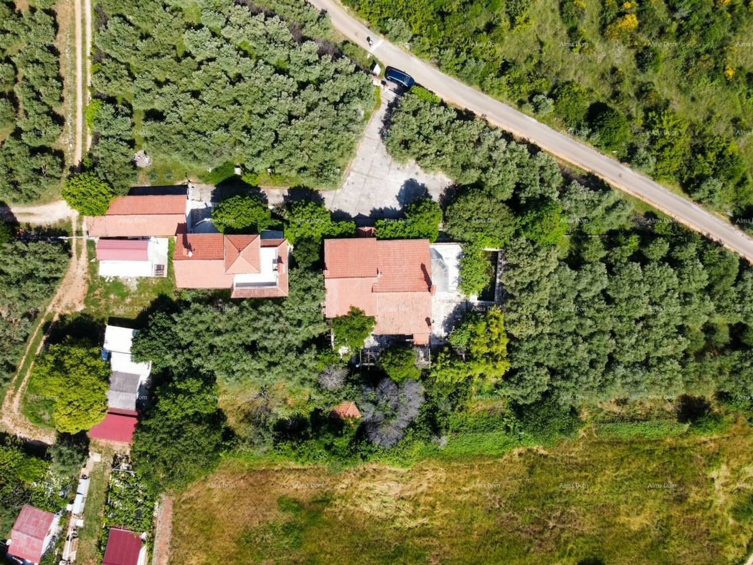 Sastoji se od dvije kuće, velike garaže, velikog vrta sa maslinama, raznim mediteranskim biljkama i bazenom.
