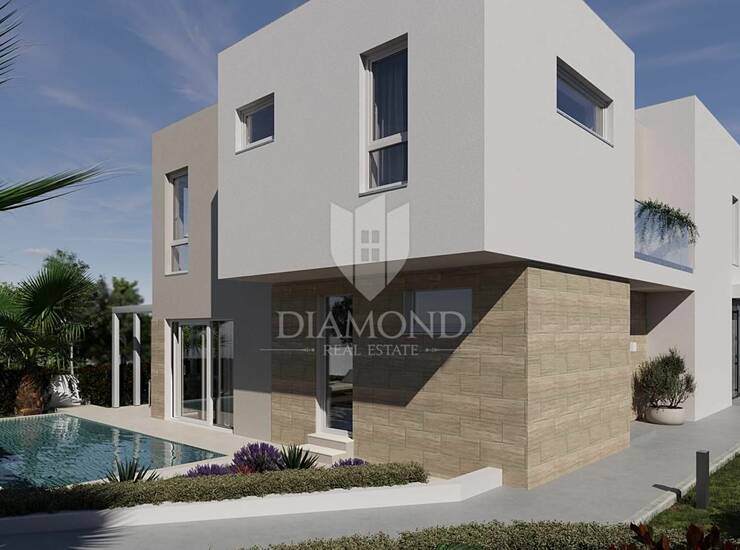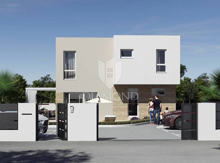 Prodaje se suvremena kuća, prva u nizu, smještena u mirnom i ugodnom naselju, idealnom za obiteljski život ili turistički najam, a istovremeno u neposrednoj blizini centra i svih važnih sadržaja. Ova novogradnja odlikuje se kvalitetnom gradnjom, modernim dizajnom i funkcionalnim rasporedom prostorija. Prizemlje se sastoji od prostranog dnevnog boravka povezanog s kuhinjom i blagovaonicom, te kupaonicom i prostranom terasom do bazena. Na katu smjestile se se tri spavaće sobe, dvije kupaonice, garderoba i terasa. Uz to, nekretnina nudi privatnu terasu, dva parkirna mjesta te obilje prirodnog svjetla tijekom cijelog dana. Idealna je za sve koji traže mir, komfor i praktičnost na jednoj lokaciji.