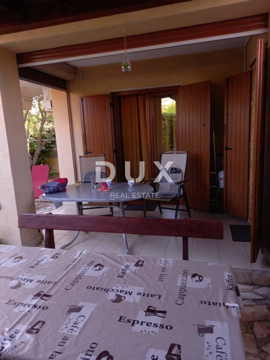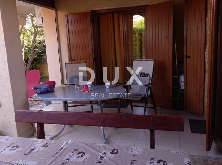 Posebna vrijednost ovog apartmana je velika terasa koja služi kao produžetak interijera. Popločana kamenom, s natkrivenim dijelom, tendom, vanjskim tušem, stolom s klupama i zelenilom – pruža savršeno okruženje za jutarnju kavu, ručak u hladu ili večernja druženja. Zasađena maslina, grmolika živica i cvijeće stvaraju dojam male privatne oaze.