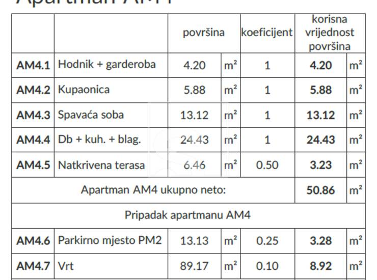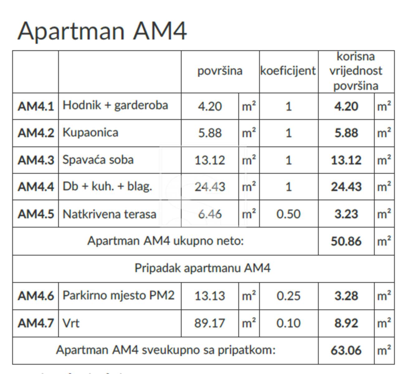 Stanovi su različitih površina i kvadratura te tako imamo nekoliko stanova s jednom spavaćom sobom (1S+DB) te nekoliko stanova s dvije spavaće sobe (2S+DB). Svakom stanu pripada po jedno parkirno mjesto smješteno ispred same zgrade.