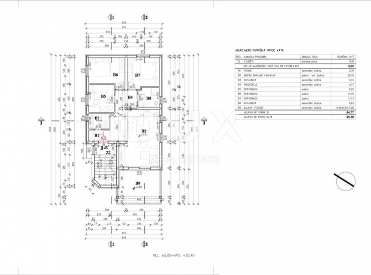 Riječ je o stanu koji se nalazi na prvome katu novogradnje, ukupne je korisne stambene površine od 84,77 m2. Stan se sastoji od ulaznog predvorja s predviđenim prostorom za garderobu, koje nas zatim uvodi u dnevni prostor stana koncipiranom po sistemu "open space" prostora, bez pregradnih zidova. Ovdje imate priliku svoje vrijeme provoditi u komotnom dnevnom boravku, idealnom za gledanje vama najdražih serija ili filmova, tu se nalazi i prostrana blagovaonica dovoljna za cijelu obitelj, te prostor predviđen za kuhinju. Iz dnevnoga se prostora proteže pristup prema natkrivenoj terasi s pogledom na more, idealnoj za ispijanje jutranje kave ili kasno večernje čaše vama najdražega vina.