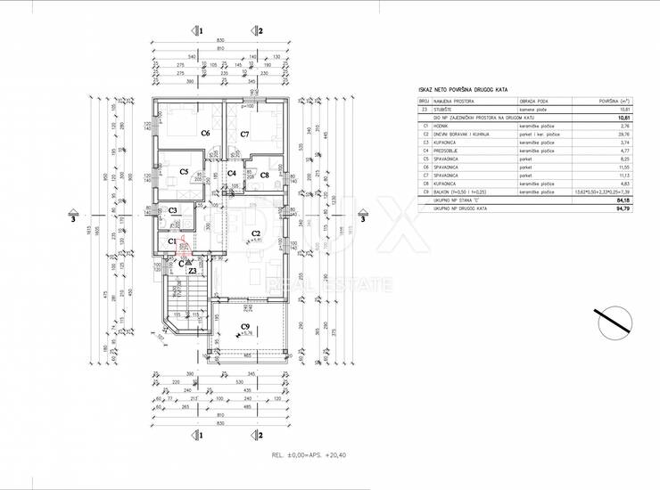 Riječ je o stanu koji se nalazi na drugome katu novogradnje, ukupne je korisne stambene površine od 84,18 m2. Stan se sastoji od ulaznog predvorja s predviđenim prostorom za garderobu, koje nas zatim uvodi u dnevni prostor stana koncipiranom po sistemu "open space" prostora, bez pregradnih zidova. Ovdje imate priliku svoje vrijeme provoditi u komotnom dnevnom boravku, idealnom za gledanje vama najdražih serija ili filmova, tu se nalazi i prostrana blagovaonica dovoljna za cijelu obitelj, te prostor predviđen za kuhinju. Iz dnevnoga se prostora proteže pristup prema natkrivenoj terasi s pogledom na more, idealnoj za ispijanje jutranje kave ili kasno večernje čaše vama najdražega vina.