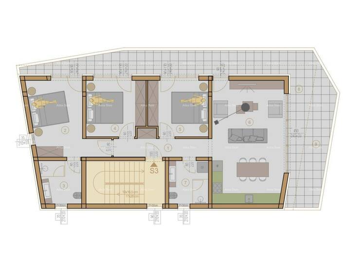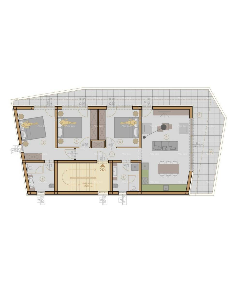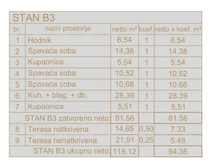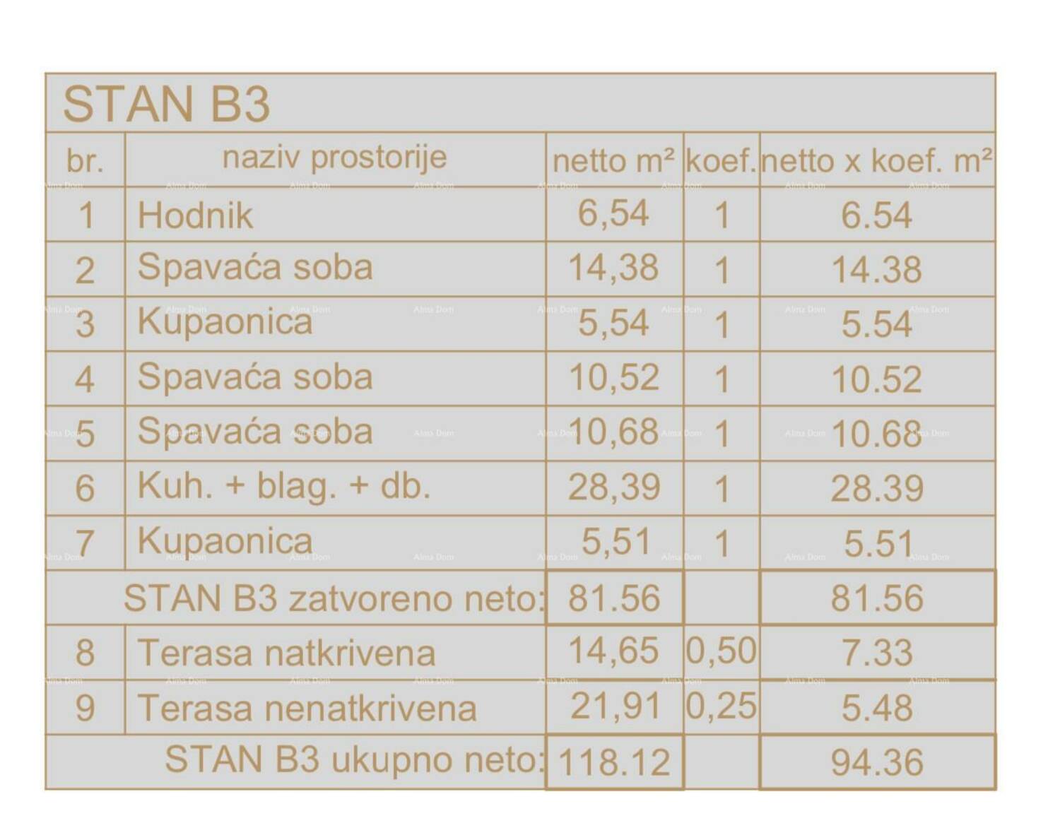 Stan B3, površine od 118.12 m2 (neto površine 94.36 m2) nalazi se na 2. katu zgrade B i sastoji od: hodnika, dnevnog boravka s kuhinjom i blagavaonom, 3 spavaće sobe, 2 kupaone, natkrivene i nenatkrivene terase.