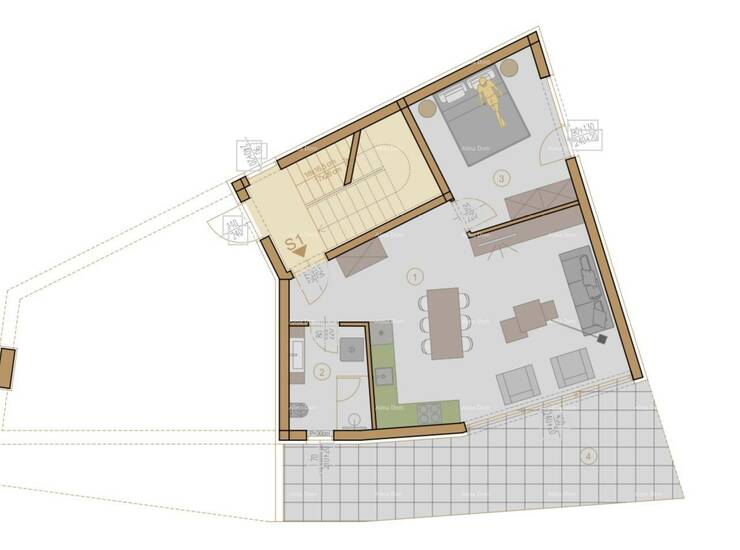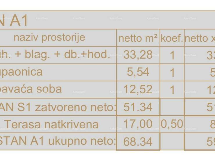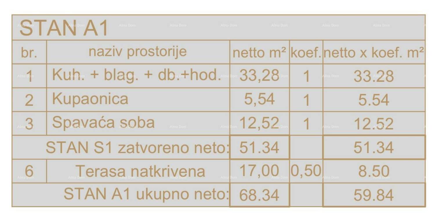 Stan A1, površine od 68.34 m2 (neto površine 59.84 m2) nalazi se u prizemlju zgrade A i sastoji od: dnevnog boravka s kuhinjom i blagavaonom, 1 spavaće sobe, 2 kupaone, natkrivene terase i vrta od 130.86 m2 (neto13.8 m2).