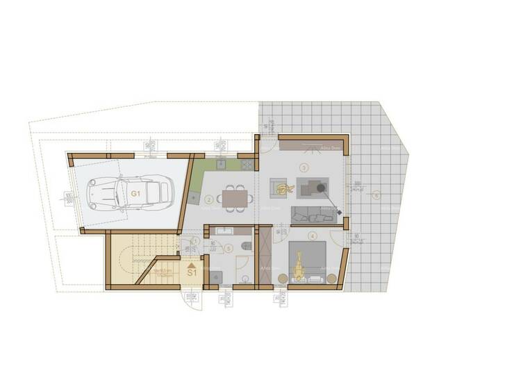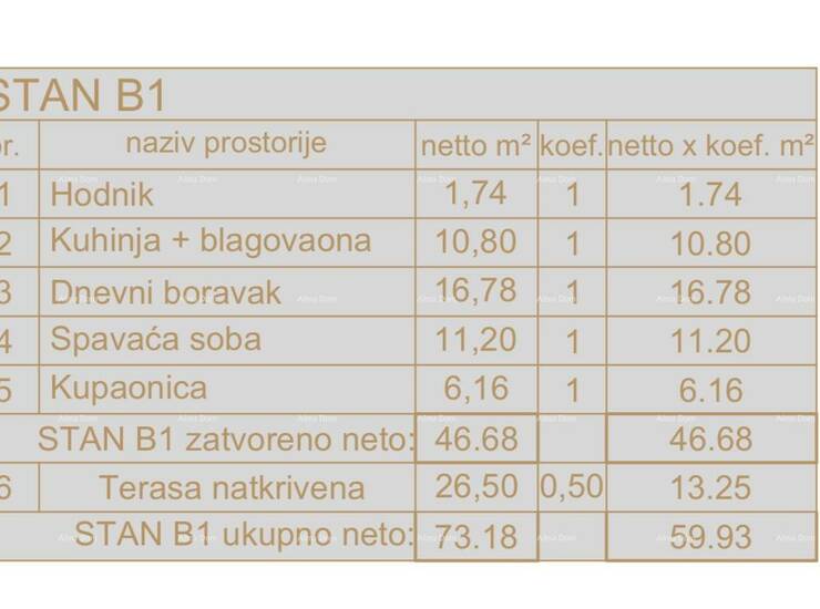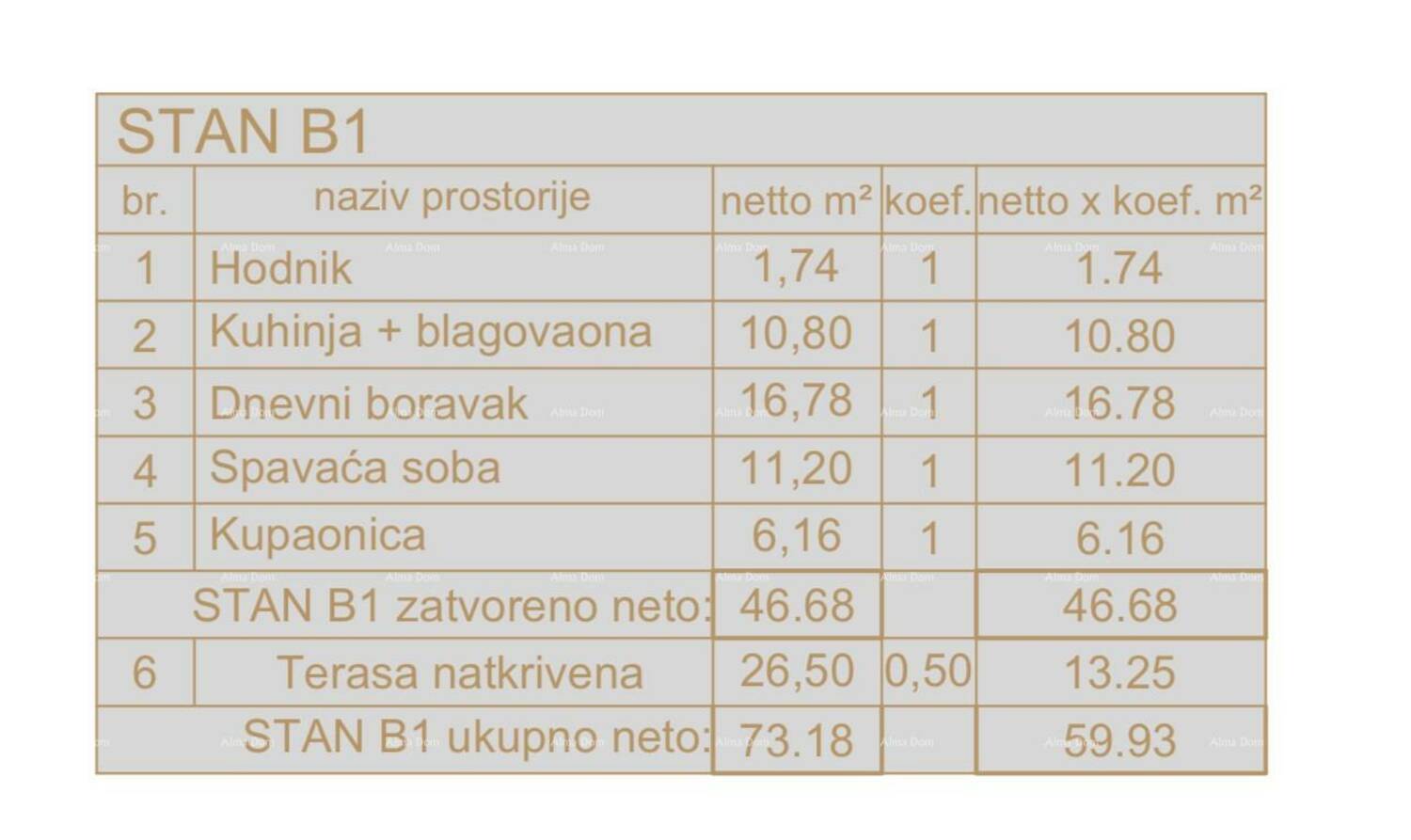 Stan B1, površine od 73.18 m2 (neto površine 59.93 m2) nalazi se u prizemlju zgrade B i sastoji od: hodnika, dnevnog boravka s kuhinjom i blagavaonom, 1 spavaće sobe, 2 kupaone, natkrivene terase i vrta od 97.19 m2 (neto 9.72 m2).