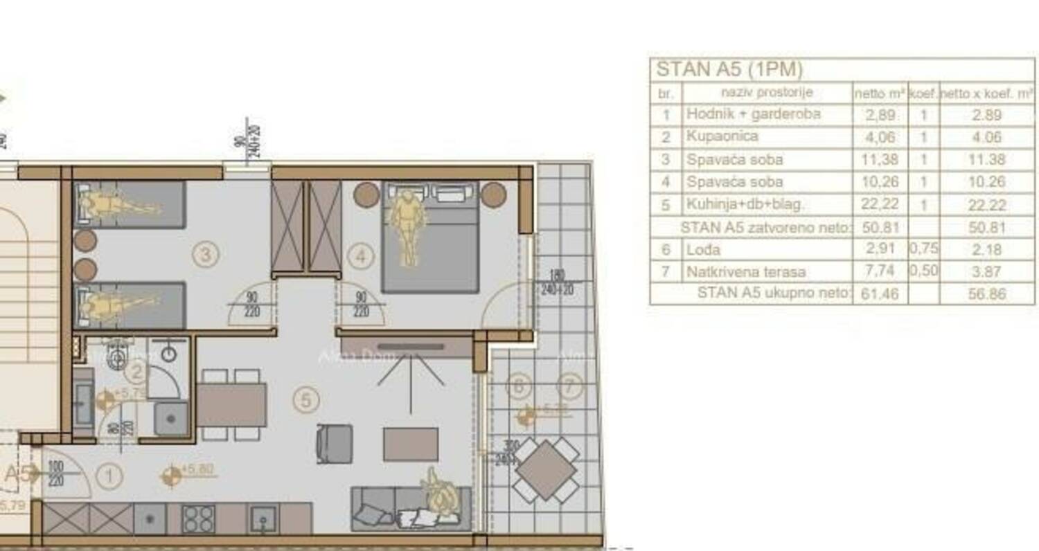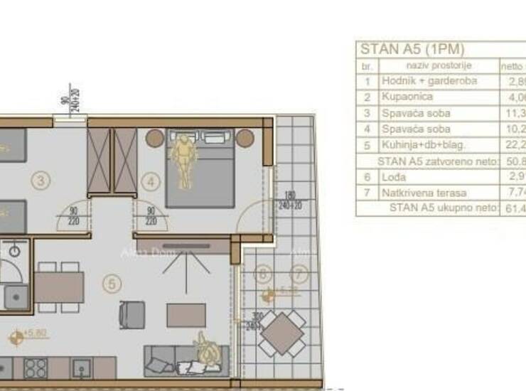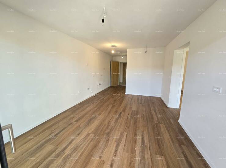 U ponudi je stan na 2. katu novogradnje koji se sastoji od hodnika s garderobom, kupaonice, dvije spavaće sobe, kuhinje s blagavaonicom te dnevnim boravkom i natkrivenom terasom.