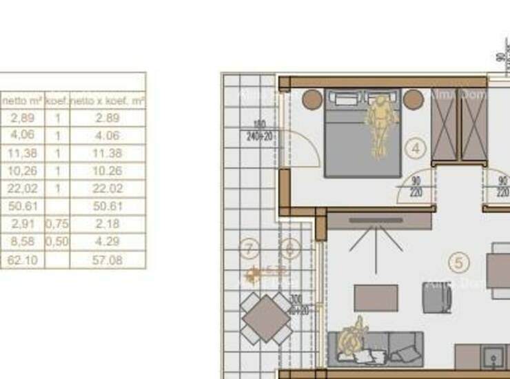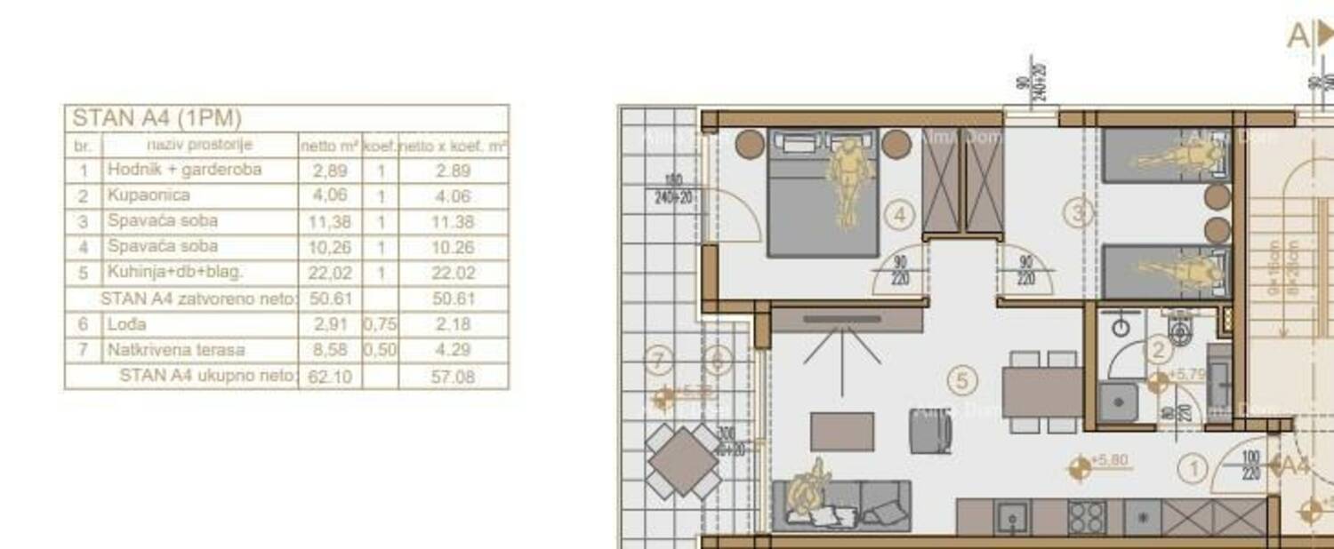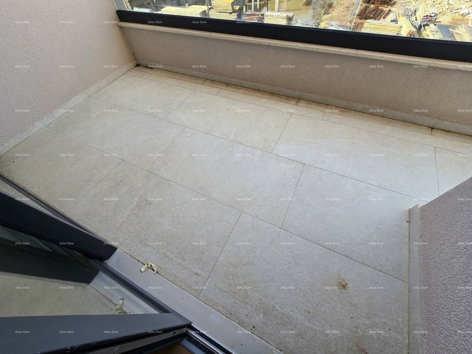 U ponudi je stan na 2. katu novogradnje koji se sastoji od hodnika, kupaonice, dvije spavaće sobe, kuhinje s blagavaonicom te dnevnim boravkom i natkrivenom terasom.
