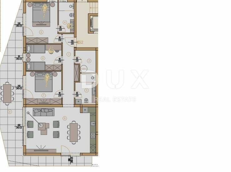 Sastoji se od hodnika s garderobom, velikog dnevnog boravka s kuhinjom i blagovaonicom s izlazom na natkrivenu terasu, 3spavaće sobe koje imaju pristup terasi , i dvije kupaonice.