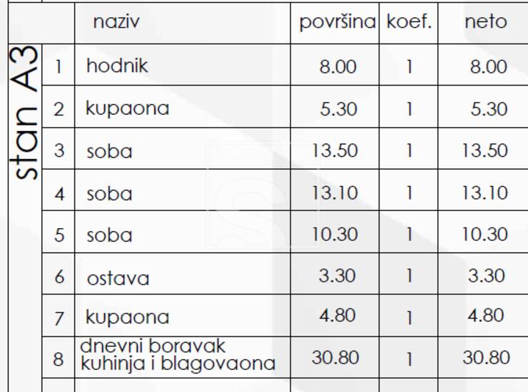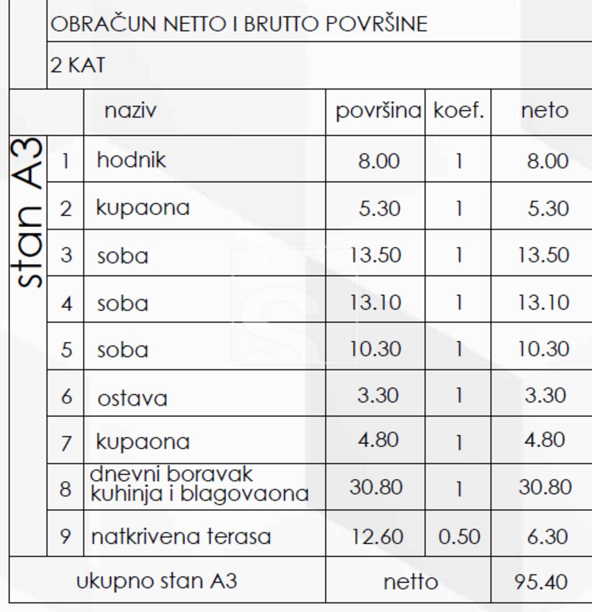 Stan se sastoji od prostranog hodnika, tri spavaće sobe, dvije kupaonice, spremišta te kuhinje s blagovaonicom i dnevnim boravkom u open space konceptu. Dnevni dio čini središnji prostor stana, a iz njega, kao i iz jedne spavaće sobe, omogućen je izlaz na prostranu terasu. Upravo s te terase, kao i iz samog stana, pruža se otvoren pogled na more, što je jedna od ključnih karakteristika ove nekretnine.