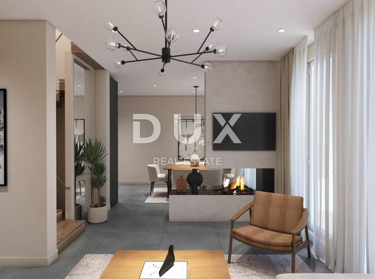 Na donjoj etaži stana nalazi se ulazni hodnik s predviđenim prostorom za garderobu, a koji nas zatim vodi prema osvijetljenom dnevnom boravaku s direktnim izlazom na vlastiti vrt i terasu – idealan prostor za opuštanje, objedovanje na otvorenom ili druženja. Dnevni prostor čini jedinstvenu cjelinu (open space) s kuhinjom i blagovaonicom, dok se u prizemlju također nalazi gostinjski toalet te dodatna ostava smještena ispod unutarnjeg stubišta.