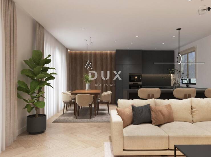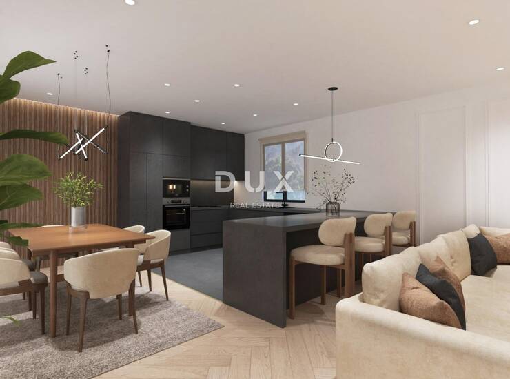 Pristupom prema 2. katu zgrade nalazimo se u sasvim otvorenom i prostranom dnevnom prostoru stana, gdje se nalazi dnevni boravak zavidnih kvadratura, blagovanica dovoljna za cijelu obitelj i prostor predviđen za kuhinju s kuhinjskim otokom.