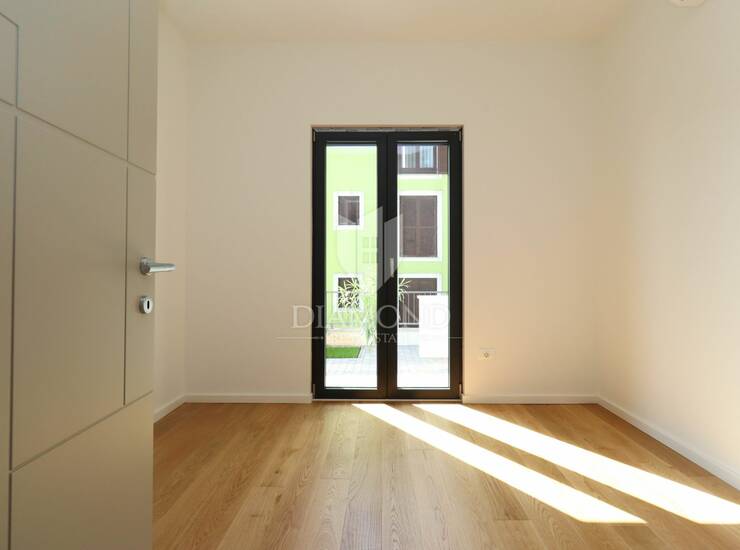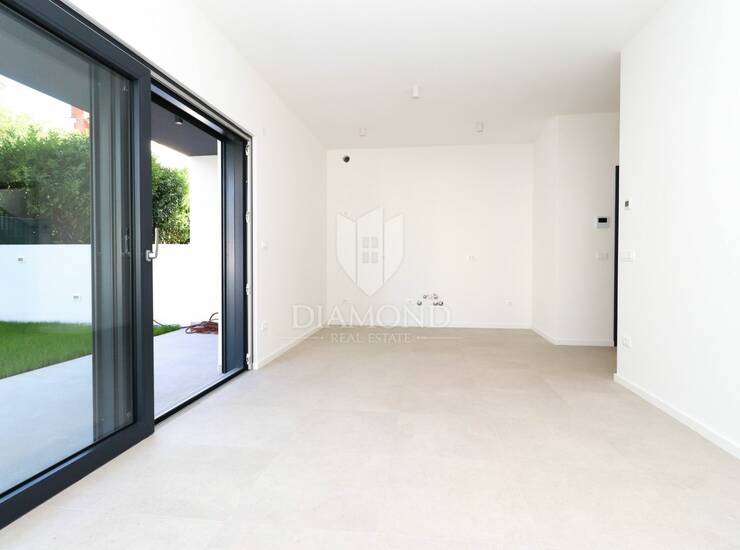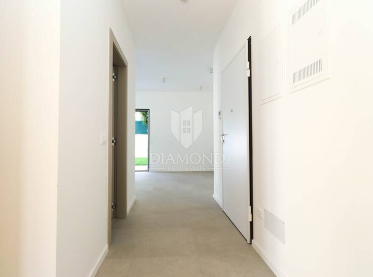 Stan se sastoji od dvije spavaće sobe, svaka s izlazom na vlastitu terasu i dvorište, ostave, kuhinje i prostranog dnevnog boravka koji vodi na veliku natkrivenu terasu idealnu za ljetna druženja. Na terasi je predviđena ljetna kuhinja, a dodatni luksuz ovog stana je privatno dvorište površine 150 m² s bazenom, okruženo zelenilom koje osigurava potpunu privatnost i mir. Stan se prodaje ključ u ruke, s dva vlastita parkirna mjesta ispred zgrade.