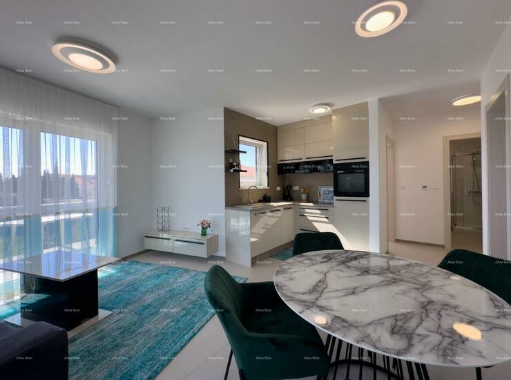Stan se nalazi na prvom katu nove zgrade i sastoji se od dvije spavaće sobe, kupatila, blagovaonice, kuhinje i dnevnog boravka iz kog se izlazi na terasu sa koje se vidi i more.