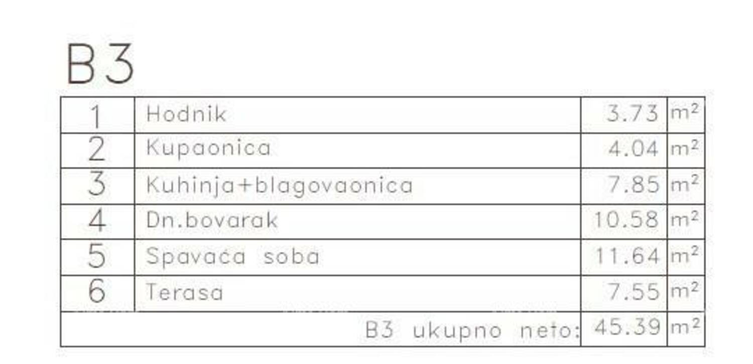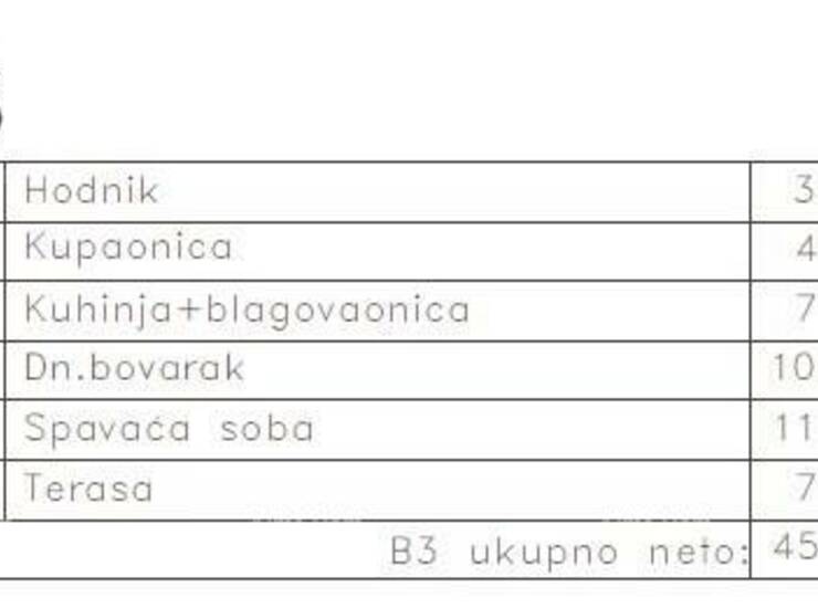 hodnika, kupaonice, kuhinje + blagovaonice, dnevnog boravka, spavaće sobe i terase. Ukupna neto površina: 45,39 m2