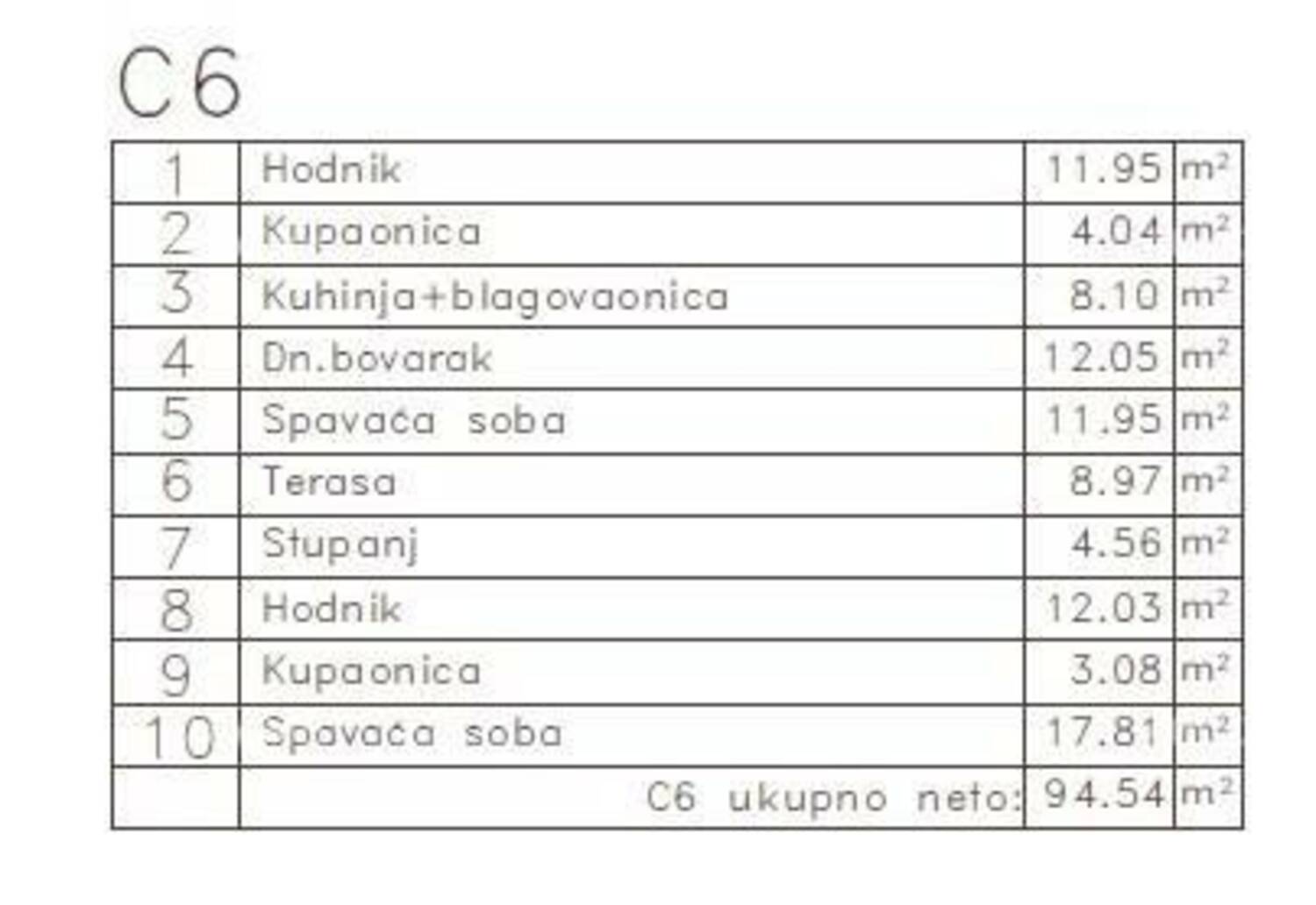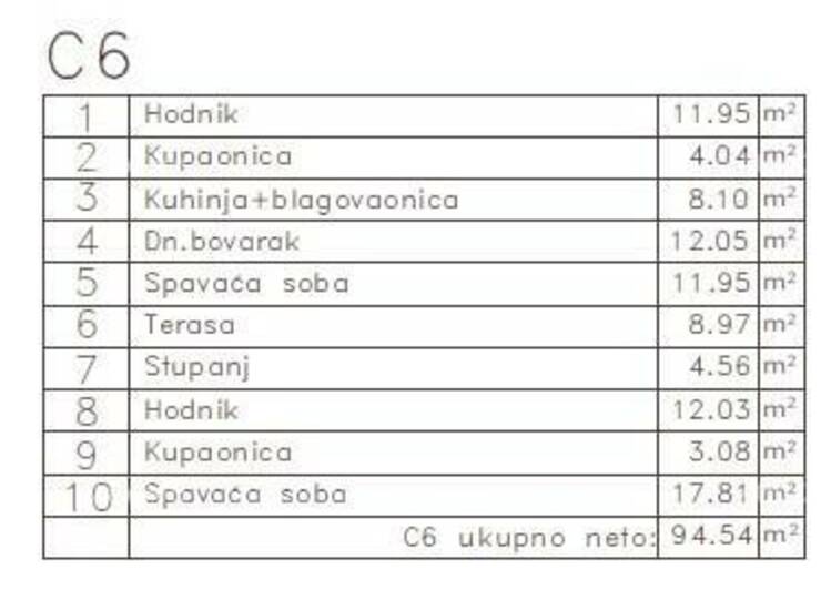 hodnika, 2 kupaonice, kuhinje + blagovaonice, dnevnog boravka, 2 spavaće sobe i terase. Ukupna neto površina: 94,54 m2