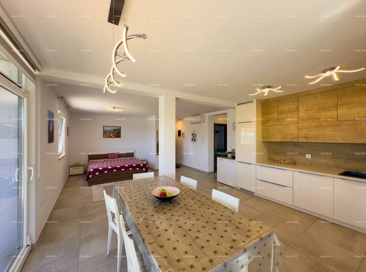 Kuhinja je potpuno moderno opremljena sa ugradbenom perilicom posuđa, mikrovalnom pećnicom i ostalom bijelom tehnikom. Stan posjeduje parlafon, internet/Wi-Fi, peć na pelet, inverter klima uređaje, grijalicu u kupaoni.