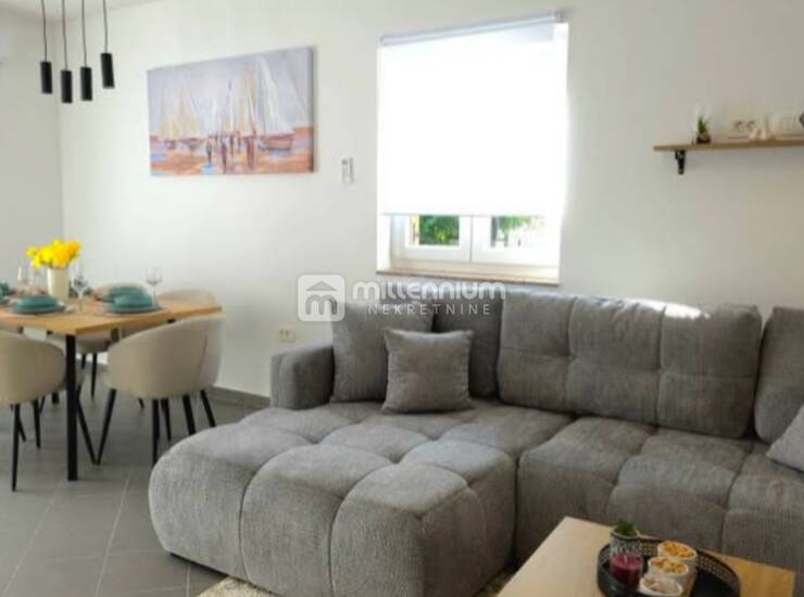 U suterenu se nalazi praktično spremište i prostor za druženje, idealan za obiteljska okupljanja ili provođenje slobodnog vremena. Prizemlje čini prozračan dnevni boravak spojen s kuhinjom i blagovaonicom u open space konceptu, iz kojeg se izlazi na terasu. Također, na istoj etaži nalaze se kupaonica i dvije udobne spavaće sobe.