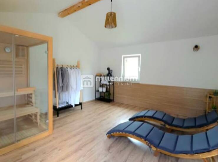 Kat kuće pruža dodatnu razinu luksuza, opremljen je saunom, jacuzzijem i velikom terasom s vrtnom garniturom, savršenom za opuštanje s pogledom na prirodu ili druženja pod otvorenim nebom.