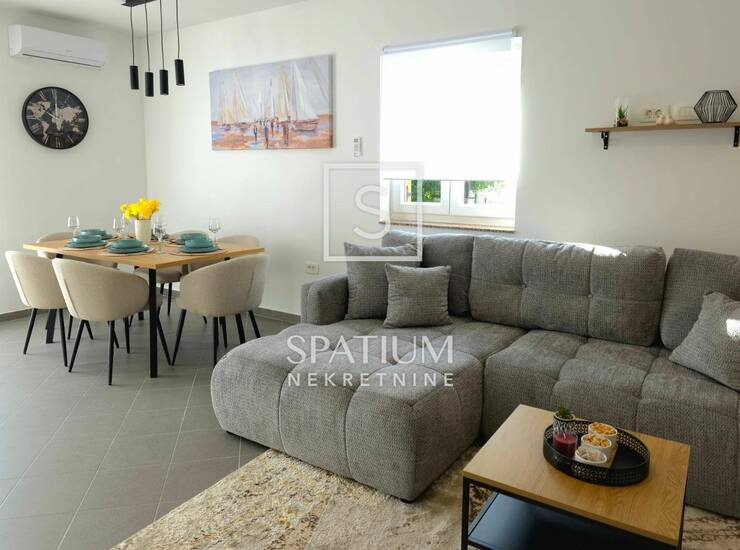 Okućnica je u potpunosti uređena i iskorištena na funkcionalan način – tu se nalaze parkiralište, dječje igralište i grill zona. Tijekom renovacije obnovljene su sve podne i zidne obloge, instalacije, sanitarije i stolarija, a postavljena je nova kuhinja i kompletan namještaj, tako da se kuća prodaje potpuno opremljena. Dokumentacija je uredna, a s obzirom na sadržaje koje nudi, nekretnina je idealna i kao obiteljska kuća i kao investicija za turistički najam.