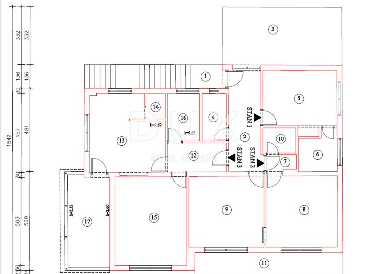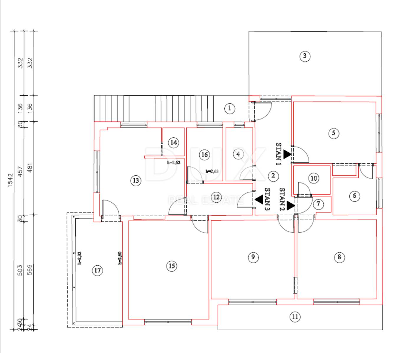 Etaža kuće nalazi se na prvom katu kuće sa sveukupno 3 stana, od čega su susjedi u prizemlju. Kat se sastoji od ulaza, zasebne terase kod ulaza, većeg hodnika koji predstavlja predvorje za 3 apartmana (pogledaj tlocrt) te spomenuta 3 apartmana.