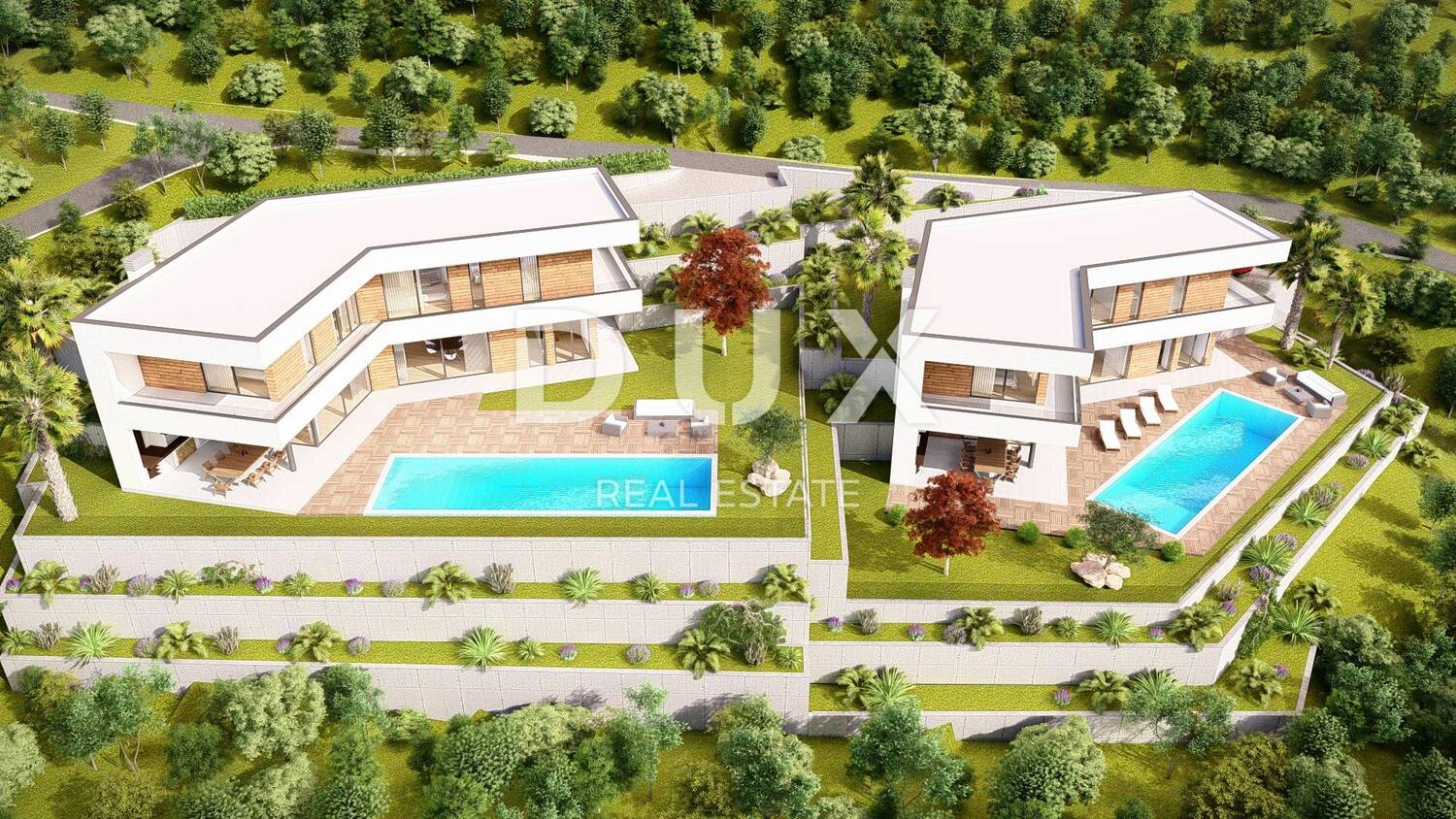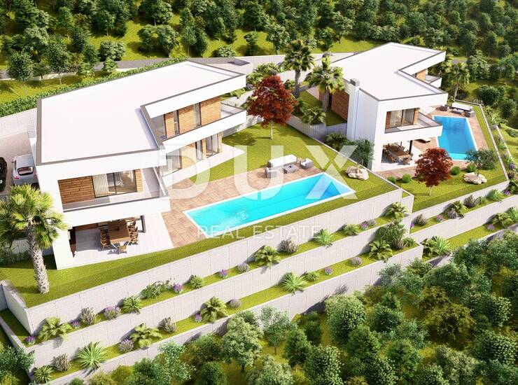 Na prodaju je građevinsko zemljište površine 1920 m² u Mošćeničkoj Dragi s pravomoćnim građevinskim dozvolama za izgradnju dvije luksuzne vile s bazenom. Zemljište dolazi s kompletnom projektnom dokumentacijom, plaćenim komunalnim i vodnim doprinosima, što omogućava trenutni početak gradnje.