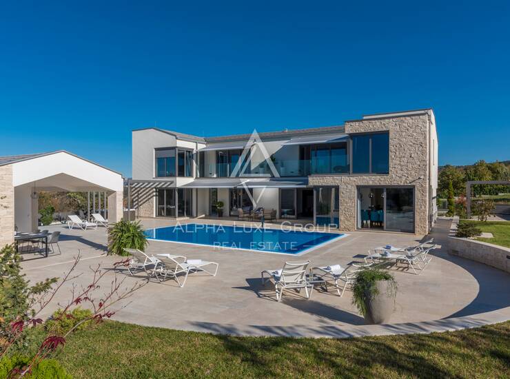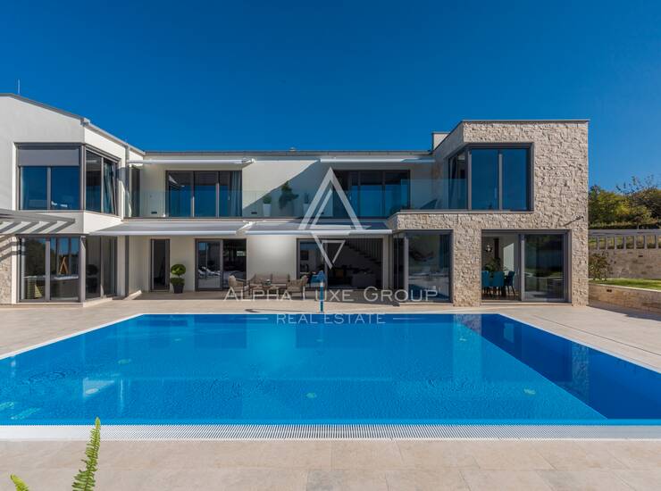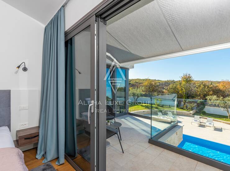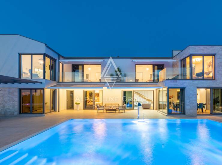 Prizemlje obuhvaća elegantan ulazni hodnik s garderobom, gostinjski toalet, spavaću sobu s vlastitom kupaonicom te prostrani open-space dnevni boravak koji povezuje modernu kuhinju, blagovaonicu i lounge zonu. Velike staklene stijene omogućuju neprekinut prijelaz između interijera i eksterijera te pružaju pogled na bazen, terasu i zelenilo. Na katu se nalaze četiri komforne spavaće sobe, svaka s vlastitom kupaonicom i balkonom, te dodatna garderoba ili praonica i visokokvalitetna sanitarna oprema.