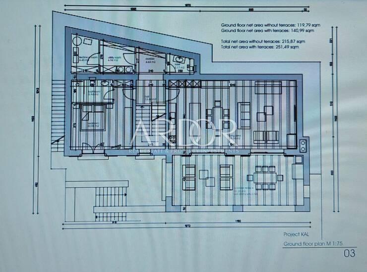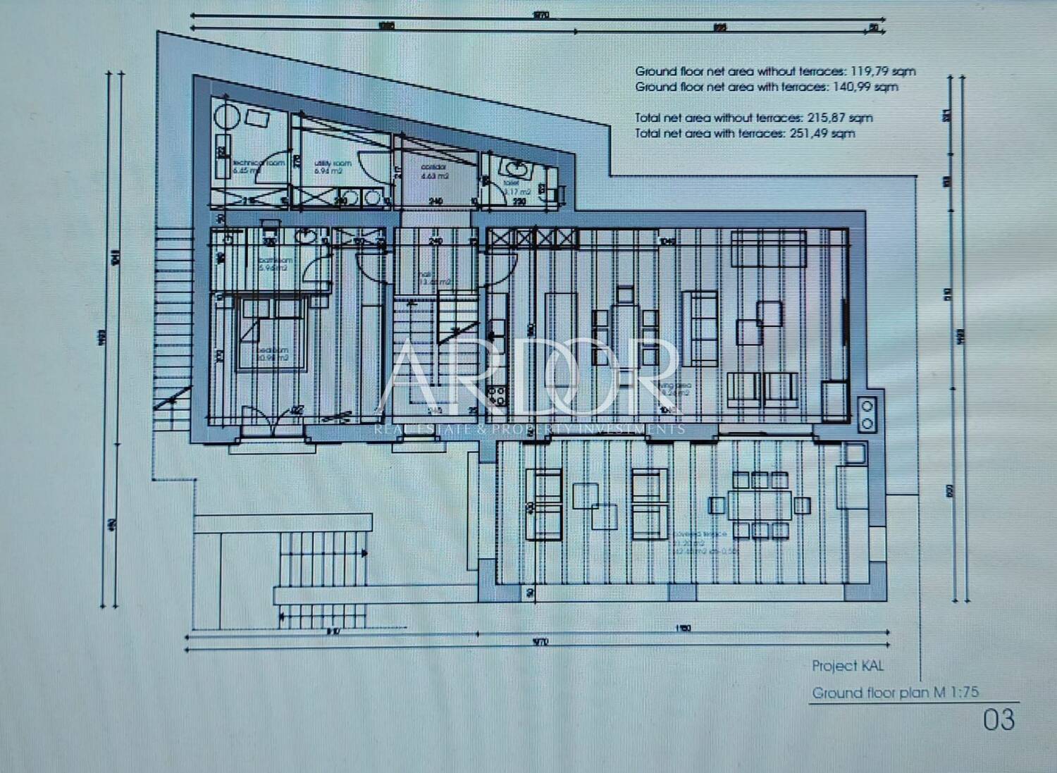 Prizemlje površine 141 m2 sastojat će se od ulaznog hodnika, open-space kuhinje, dnevnog boravka i blagovaonice, jedne spavaće sobe sa vlastitom kupaonicom, WC-a za goste, ostave te velike natkrivene terase sa prostorom za objedovanje.