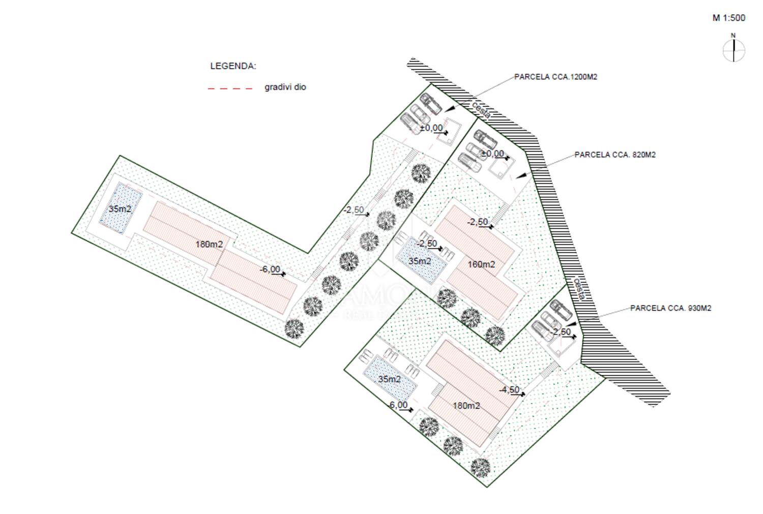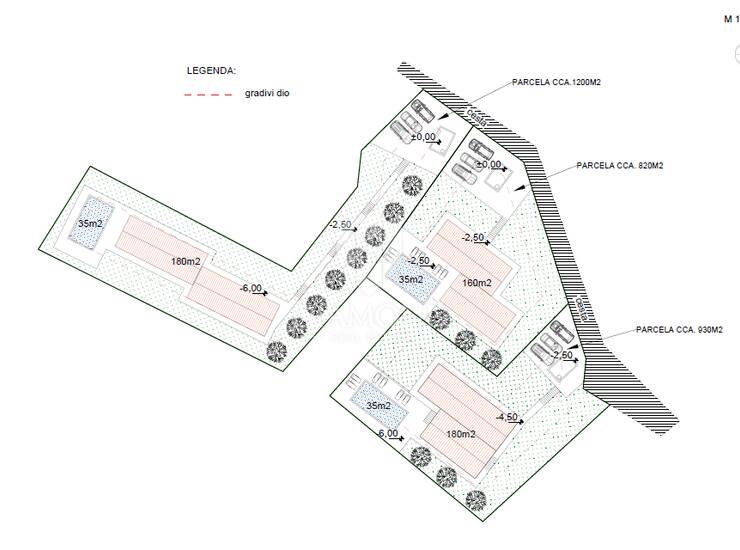 Postoji idejni projekt kojim je na zemljištu moguće izgraditi i do 4 jedinice, sa većom ili manjom okućnicom sve po želji budućeg vlasnka. Projekt predviđa mogućnost gradnje 3 samostojeće kuće tlocrta od 180m2 plus kat, uz bazen 35m2 te okućnicom od 900 do 1200m2.